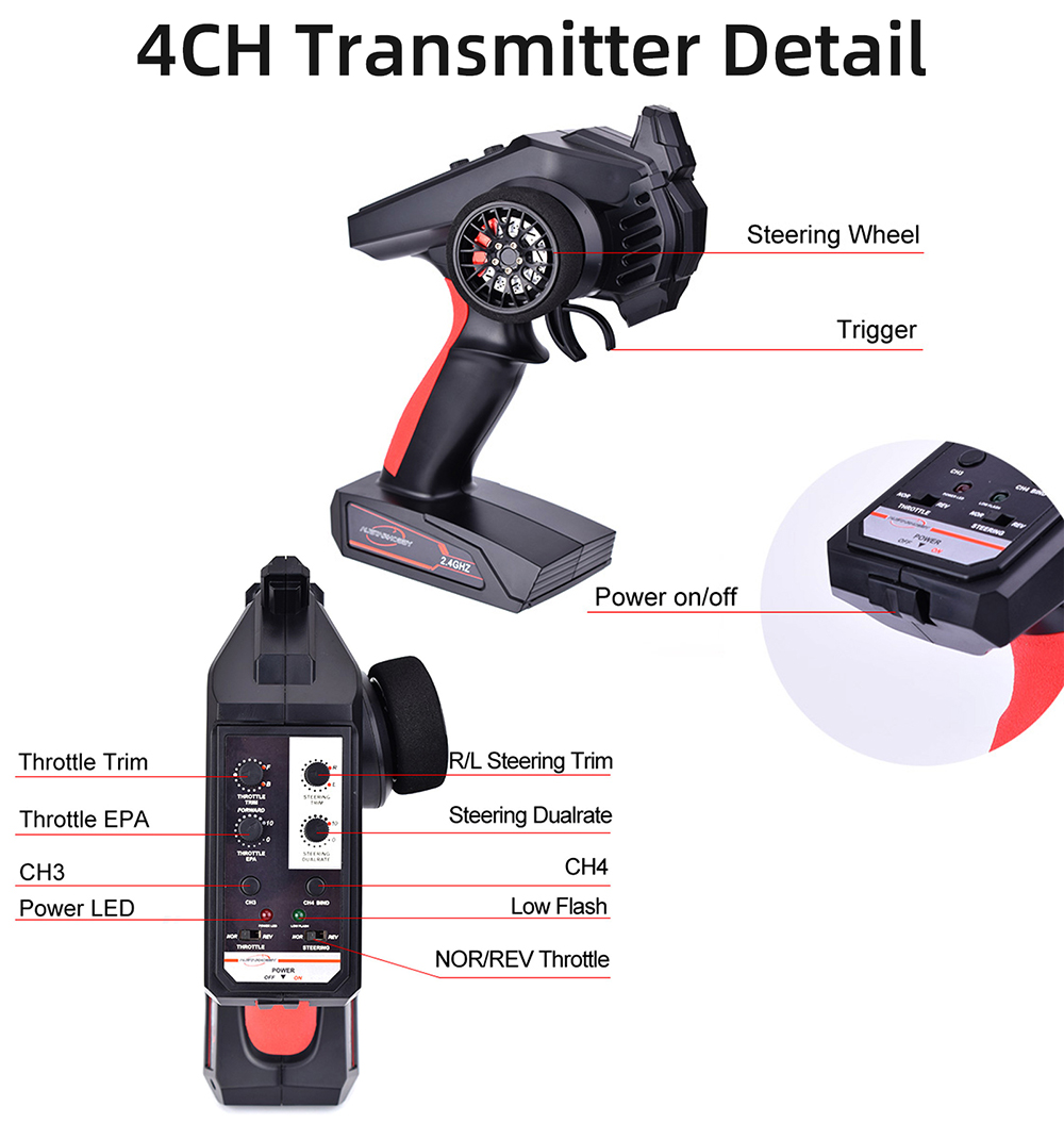 This product is specially developed for remote control cars and boats. It possesses super active and passive anti-jamming capabilities, very low power consumption and high receiving sensitivity. Special speed limit function! Let the beginners can control the car within limited speed range! It has a special Throttle limit switch!