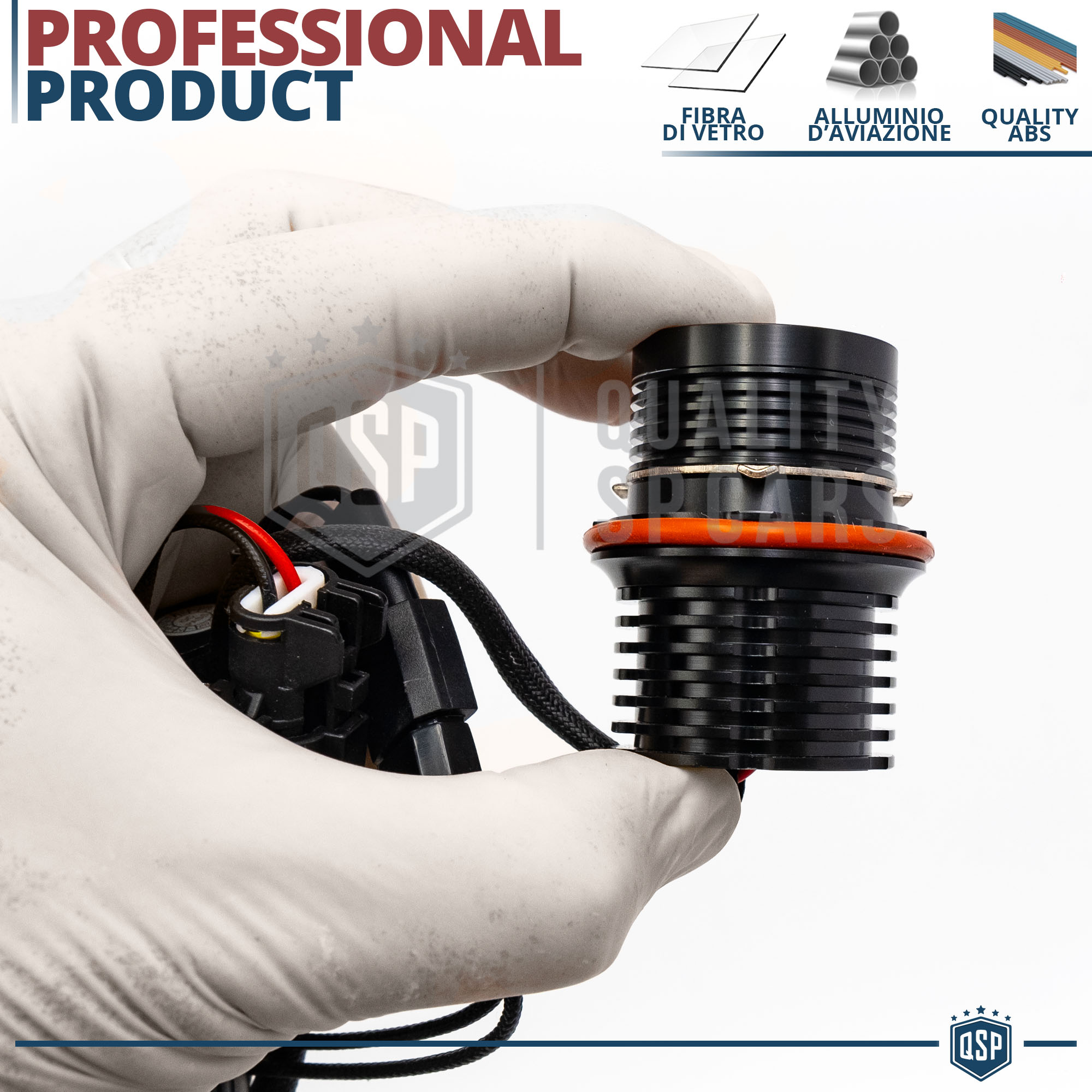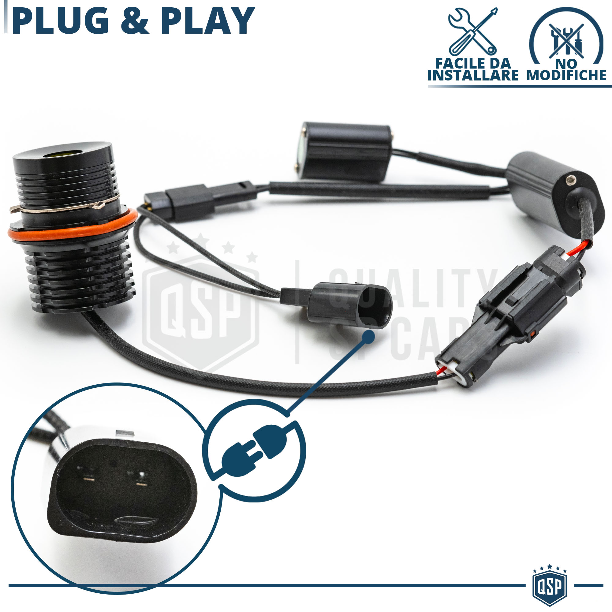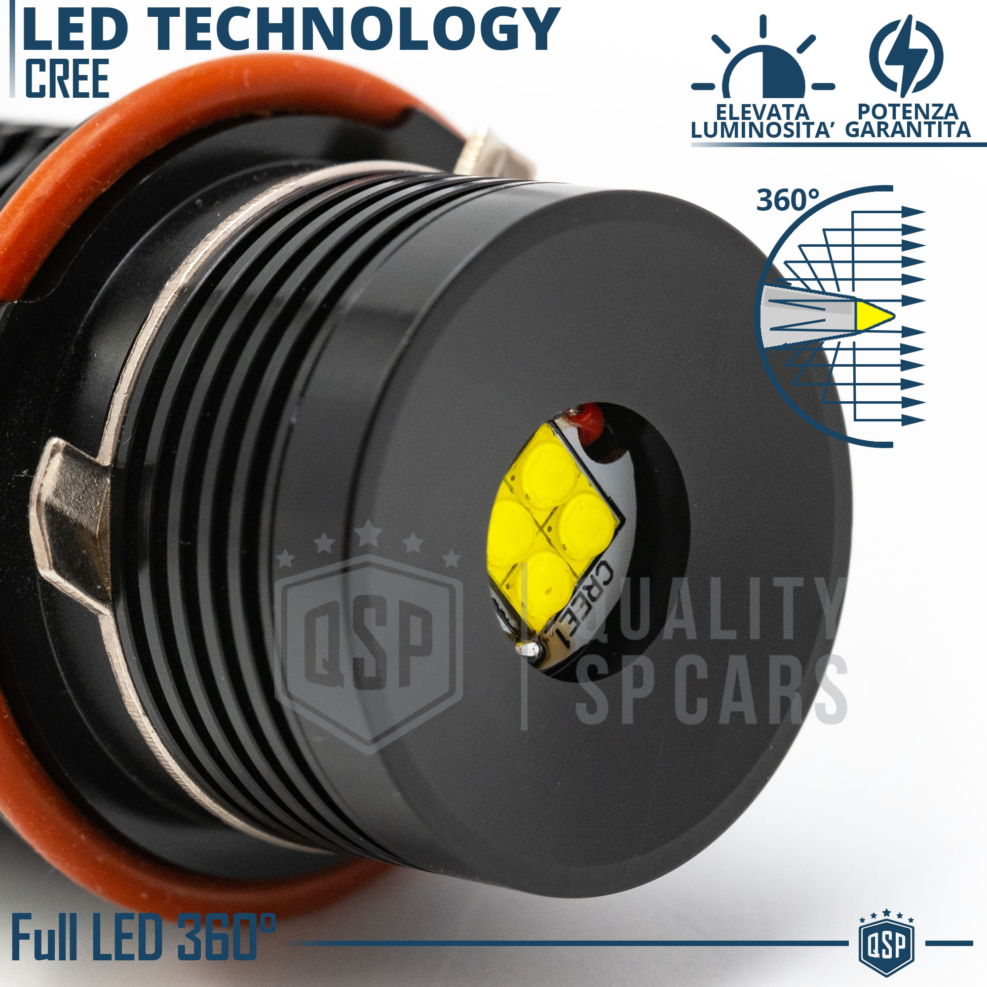 Kit Conversione Luci LED Angel Eyes Bianco Ghiaccio di Nuova Generazione, sono Lampadine LED Professionali che si Sostituiscono alle lampadine alogene di Serie Illuminando gli Anelli dei Fari Bmw con una Luce LED Bianca e Densa, sono CANbus ovvero NON creano Errori sul display della Vettura e non Necessitano di Adattamenti sul Veicolo per l'installazione, sono PLUG and PLAY, (solo Collegamento).
