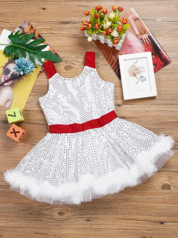 Kids Girls Ballet Latin Dance Costume Cami Dress Sequins Faux Fur Adorned Dance Leotard.