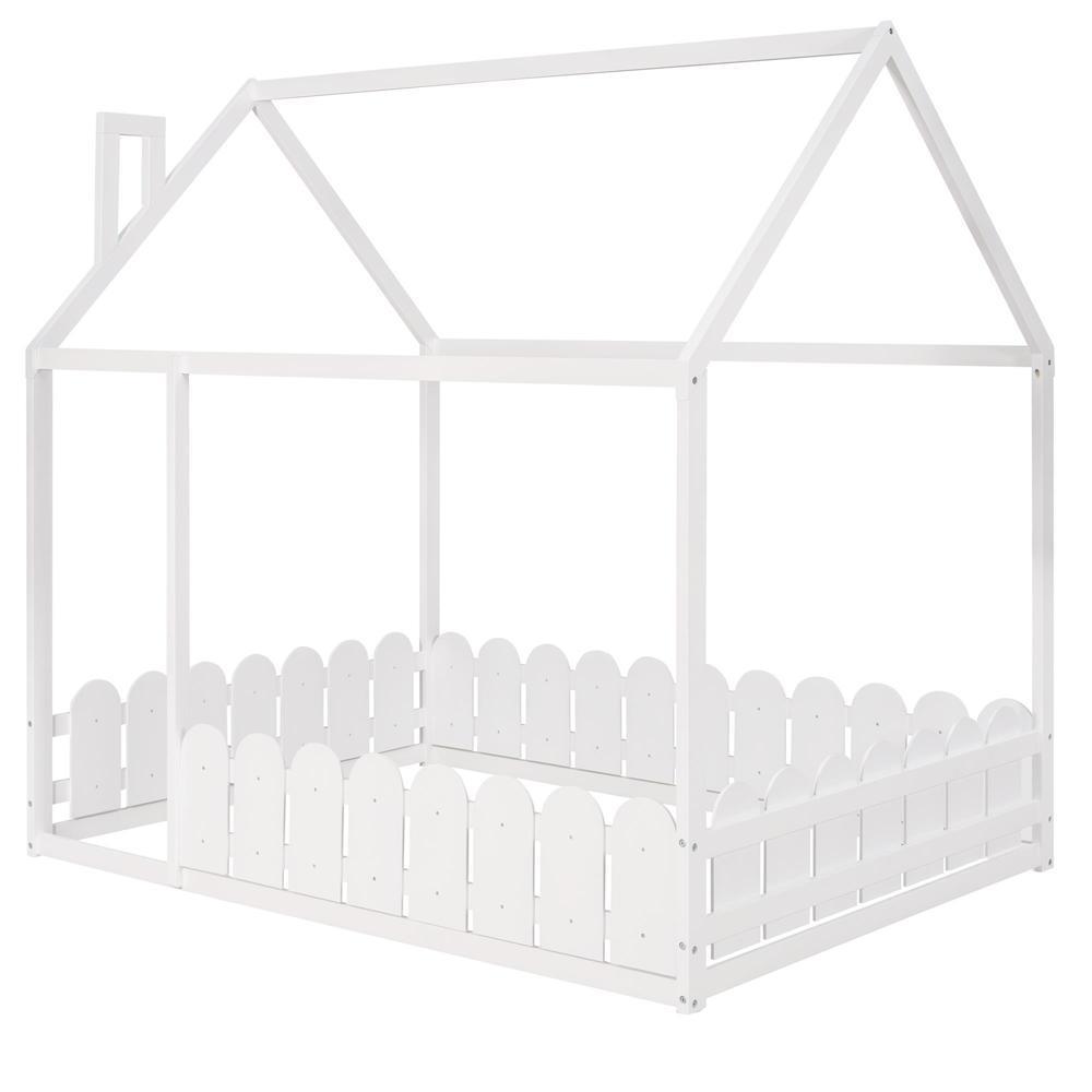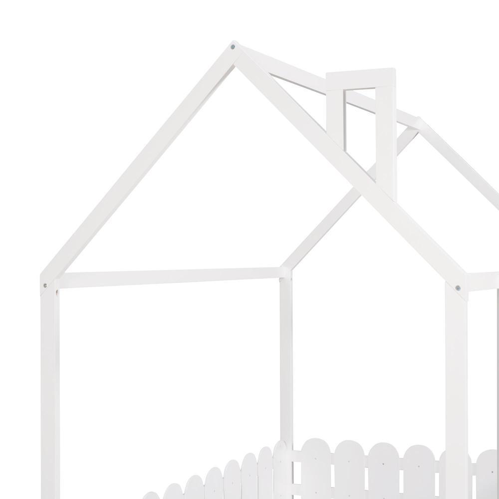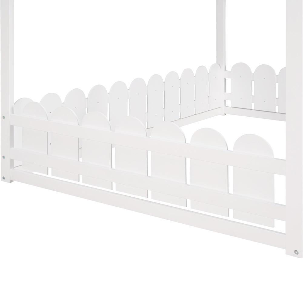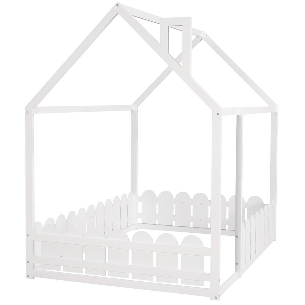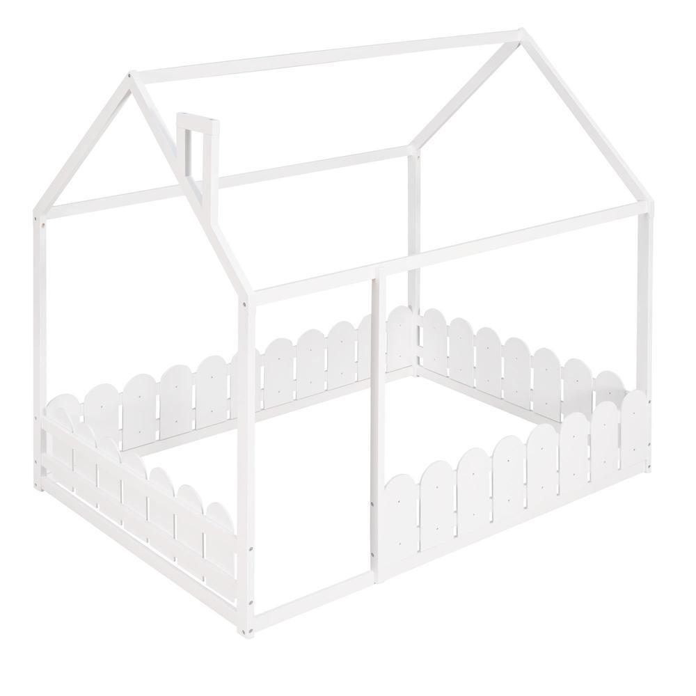 Full Size Wood Bed House Bed Frame with Fence for Kids Teens Girls Boys White