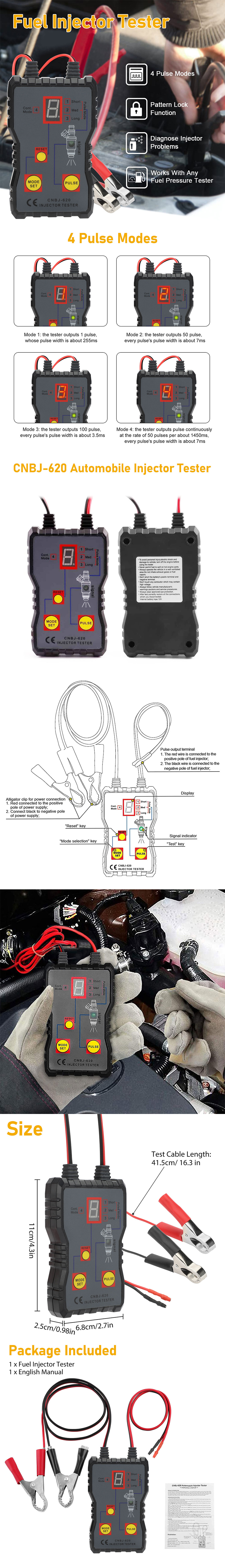 - ✨4 Pulse Modes:The injector Tester comes with an LED display and 4 pulse modes - Single / Short / Long/ Continuous modes. It can help you identify whether the injector is good or not when you switch off the engine.