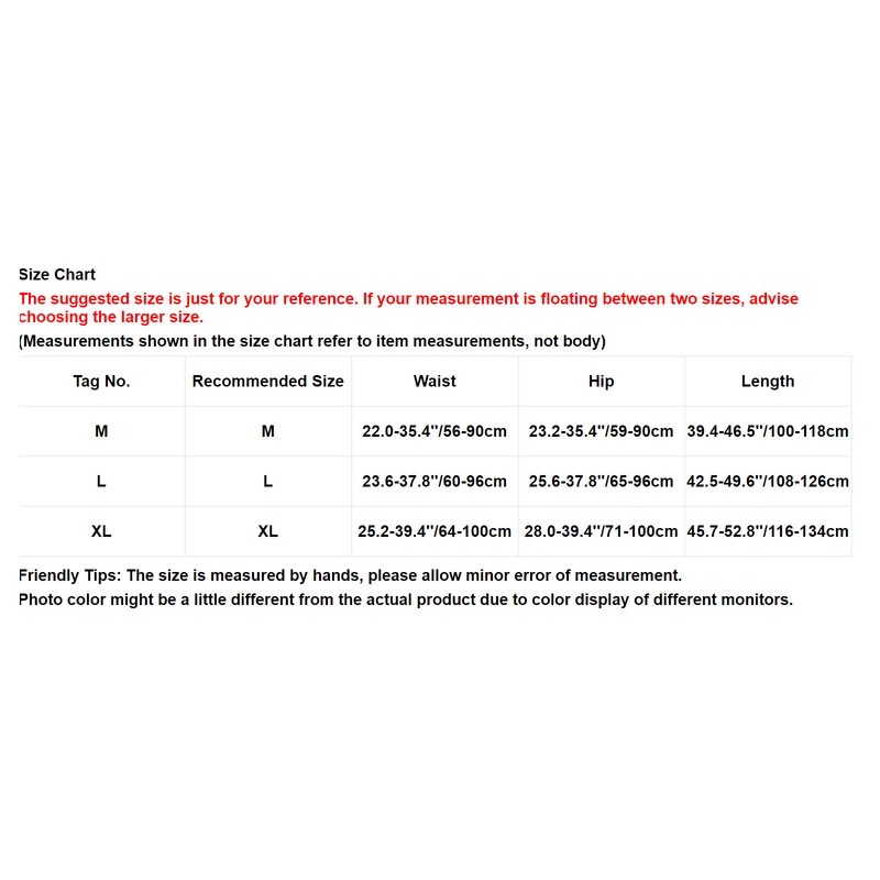 Size Chart:The suggested size is just for your reference. If your measurement is floating between two sizes, advise choosing the larger size. (Measurements shown in the size chart refer to item measurements, not body)