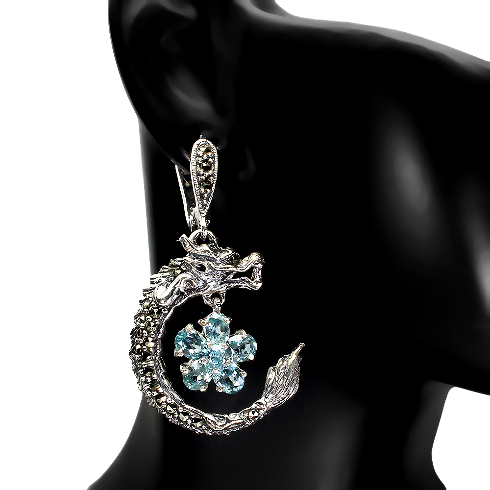 Oval Blue Zircon 4x3mm Marcasite 925 Sterling Silver Dragon Earrings