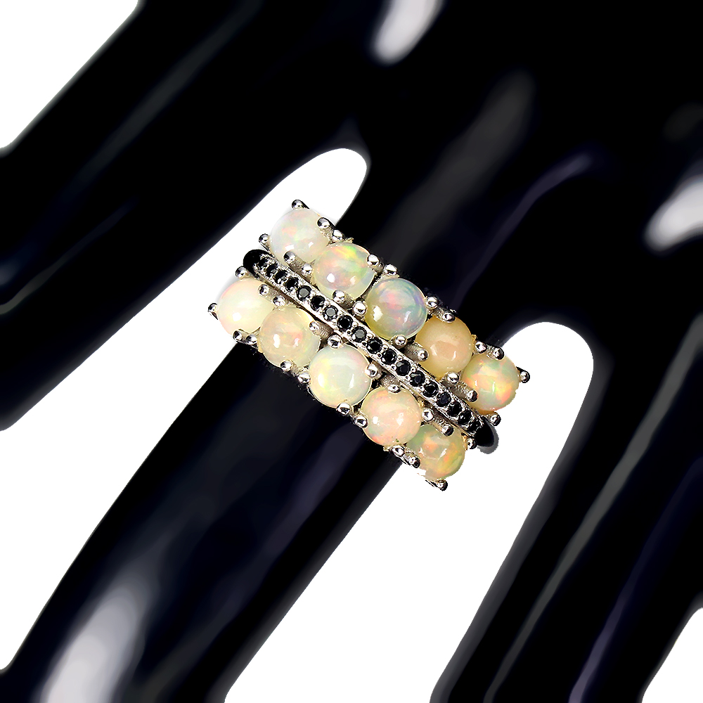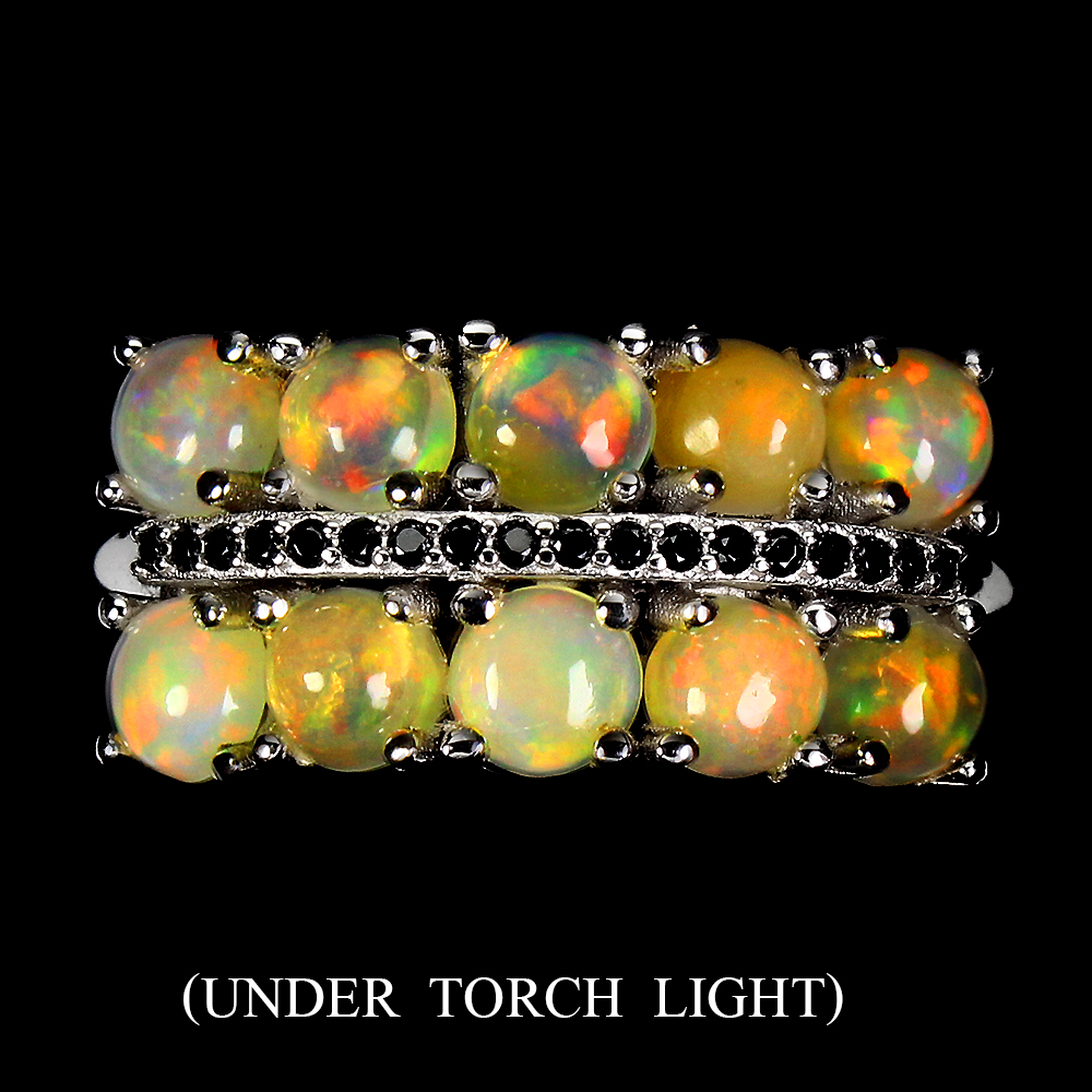 Unheated Round Fire Opal Rainbow 4mm Black Spinel 925 Sterling Silver Ring 8