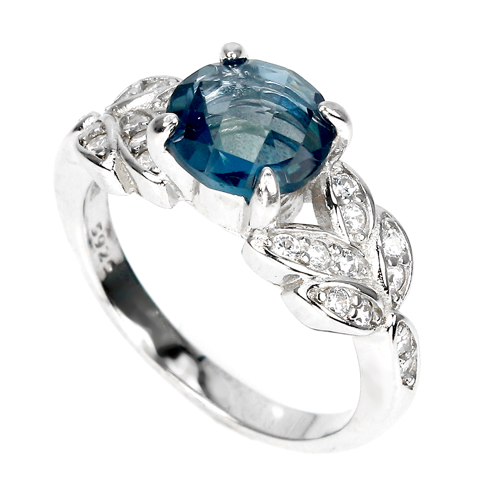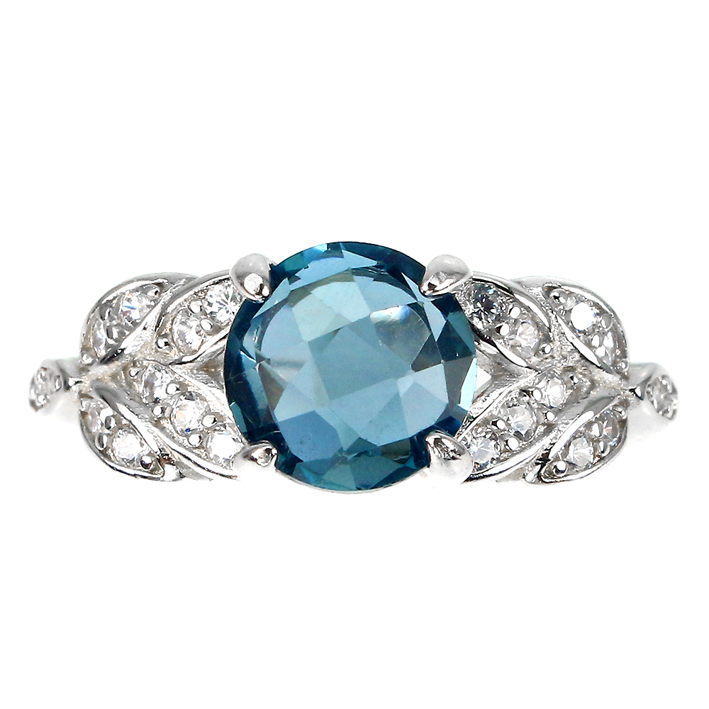 Round London Blue Topaz 8mm Cz 14K White Gold Plate 925 Sterling Silver Ring