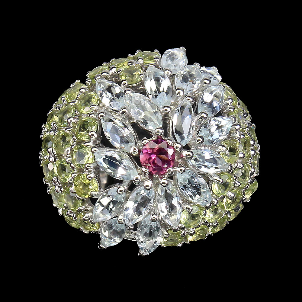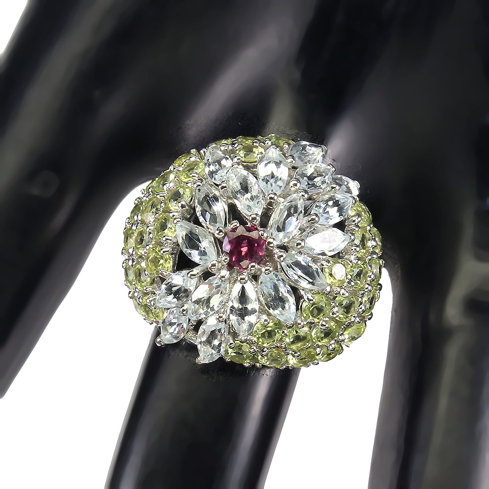 Unheated Marquise Aquamarine 5x2.5mm Peridot Rhodolite 925 Sterling Silver Ring