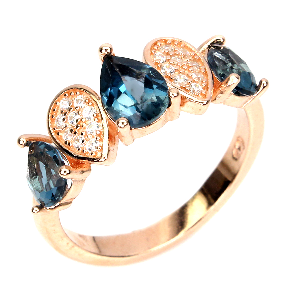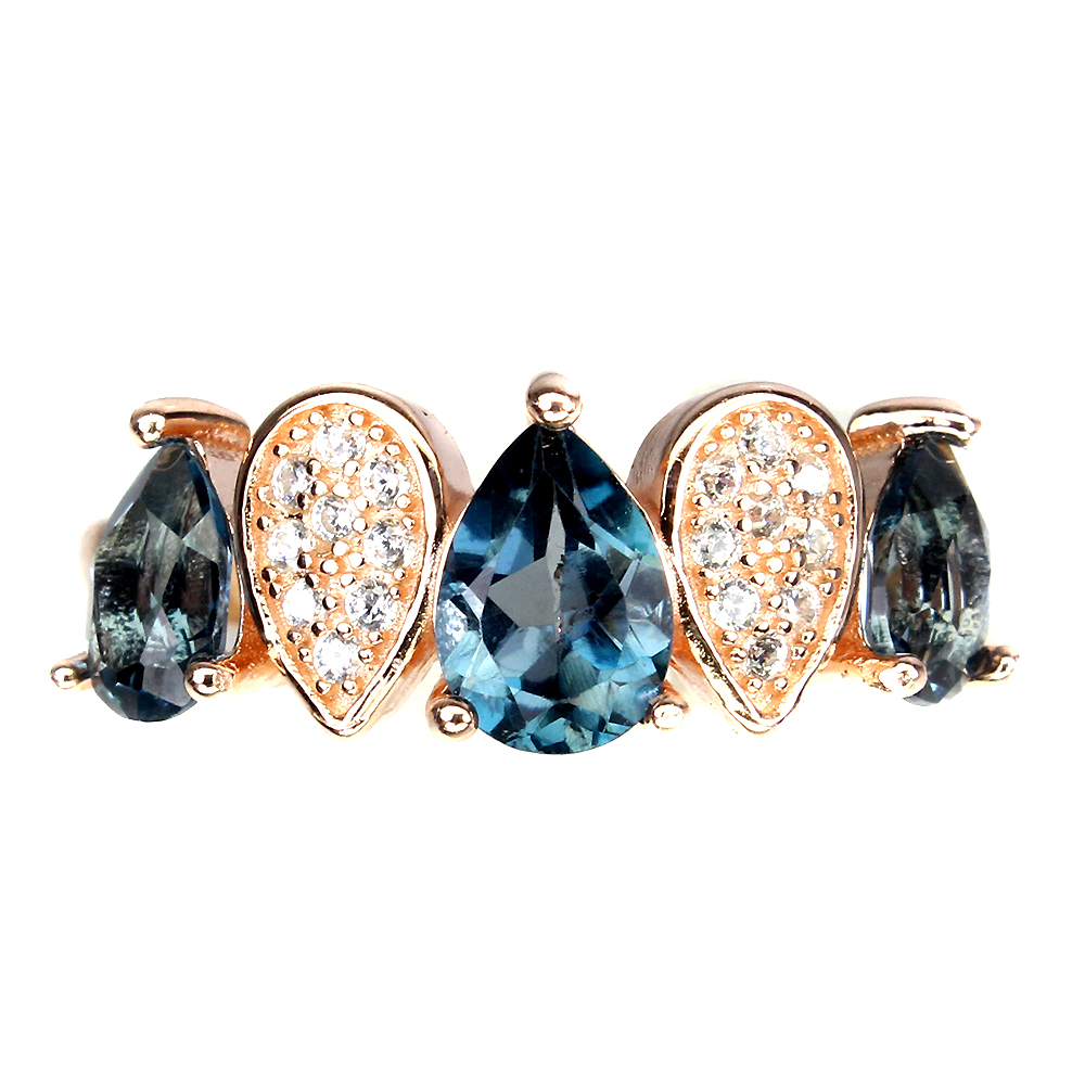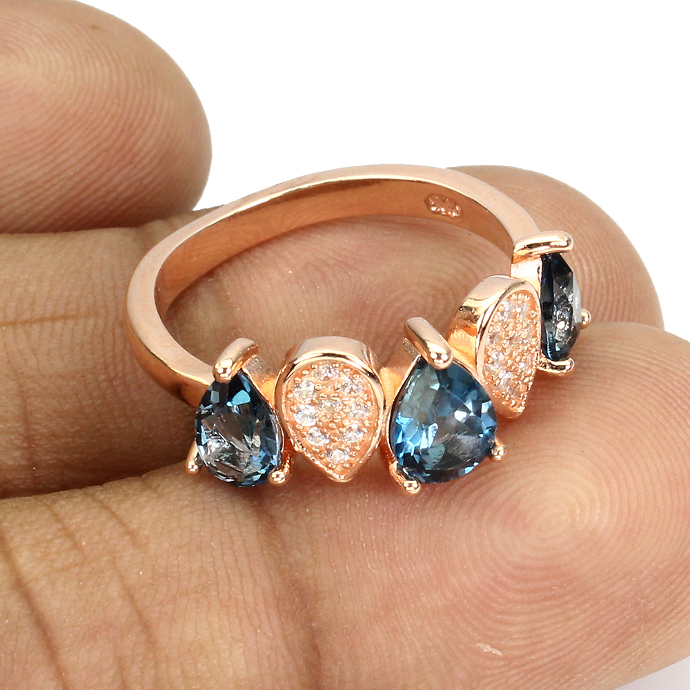 Pear London Blue Topaz 7x5mm Cz 14K Rose Gold Plate 925 Sterling Silver Ring 6.5
