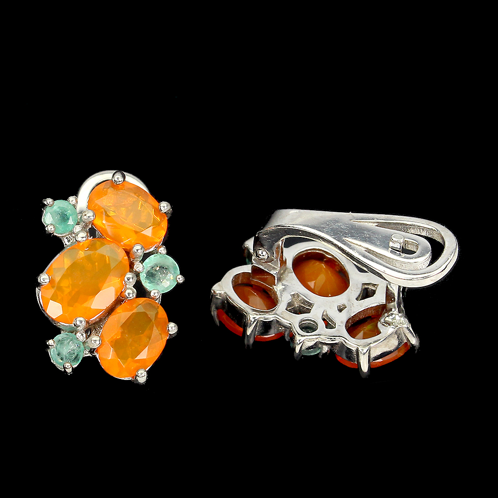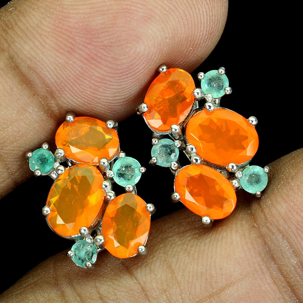 Oval Orange Fire Opal 8x6mm Emerald 925 Sterling Silver Earrings