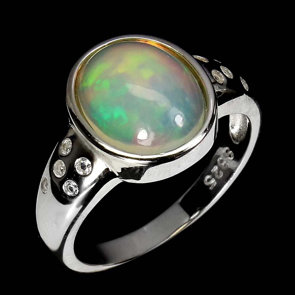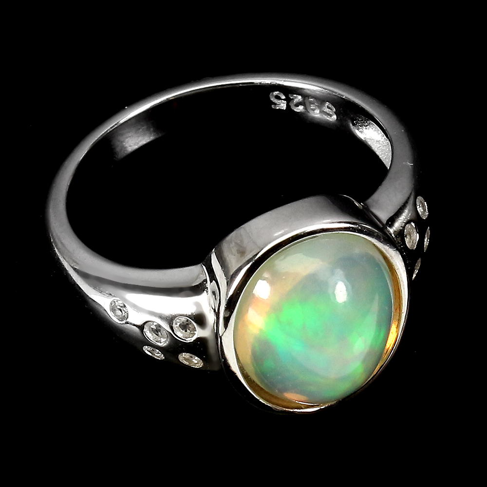 Unheated Oval Fire Opal Rainbow 11x9mm White Topaz 925 Sterling Silver Ring