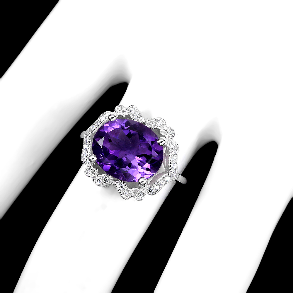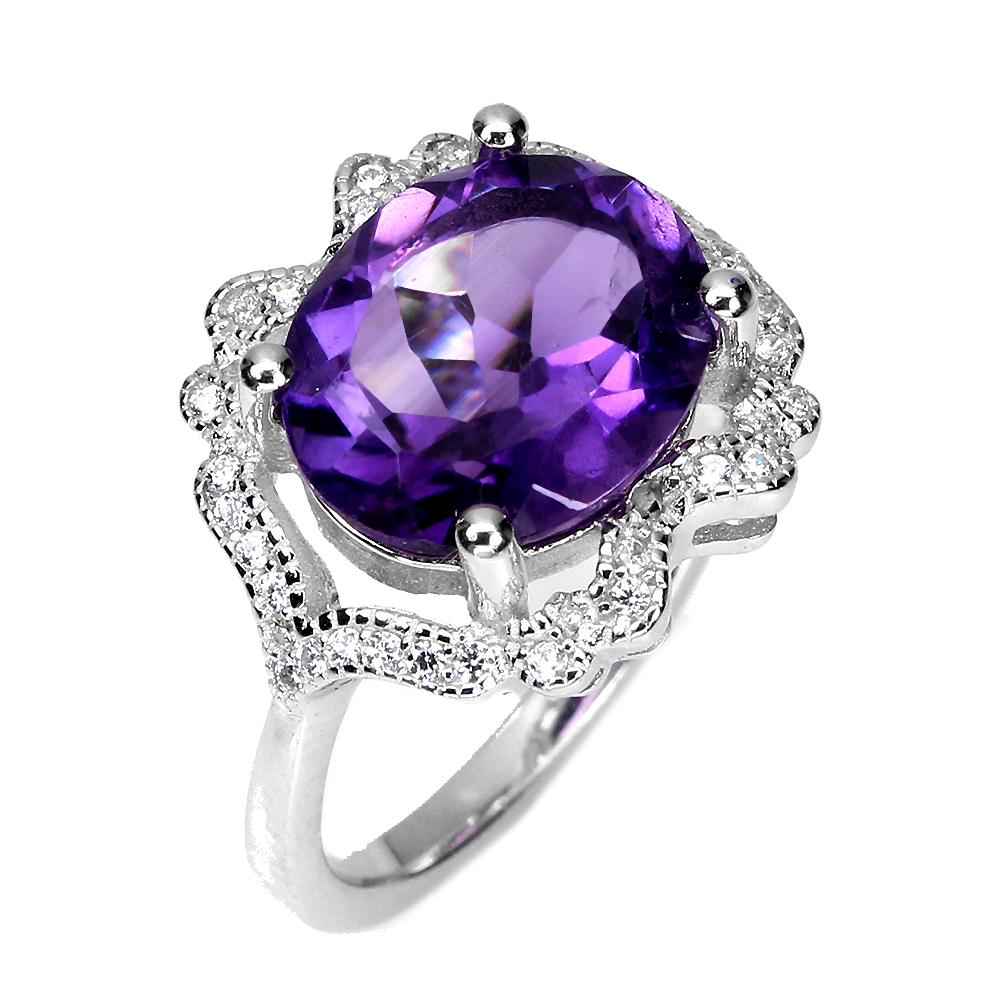 Unheated Oval Amethyst 12x10mm Cz 14K White Gold Plate 925 Sterling Silver Ring