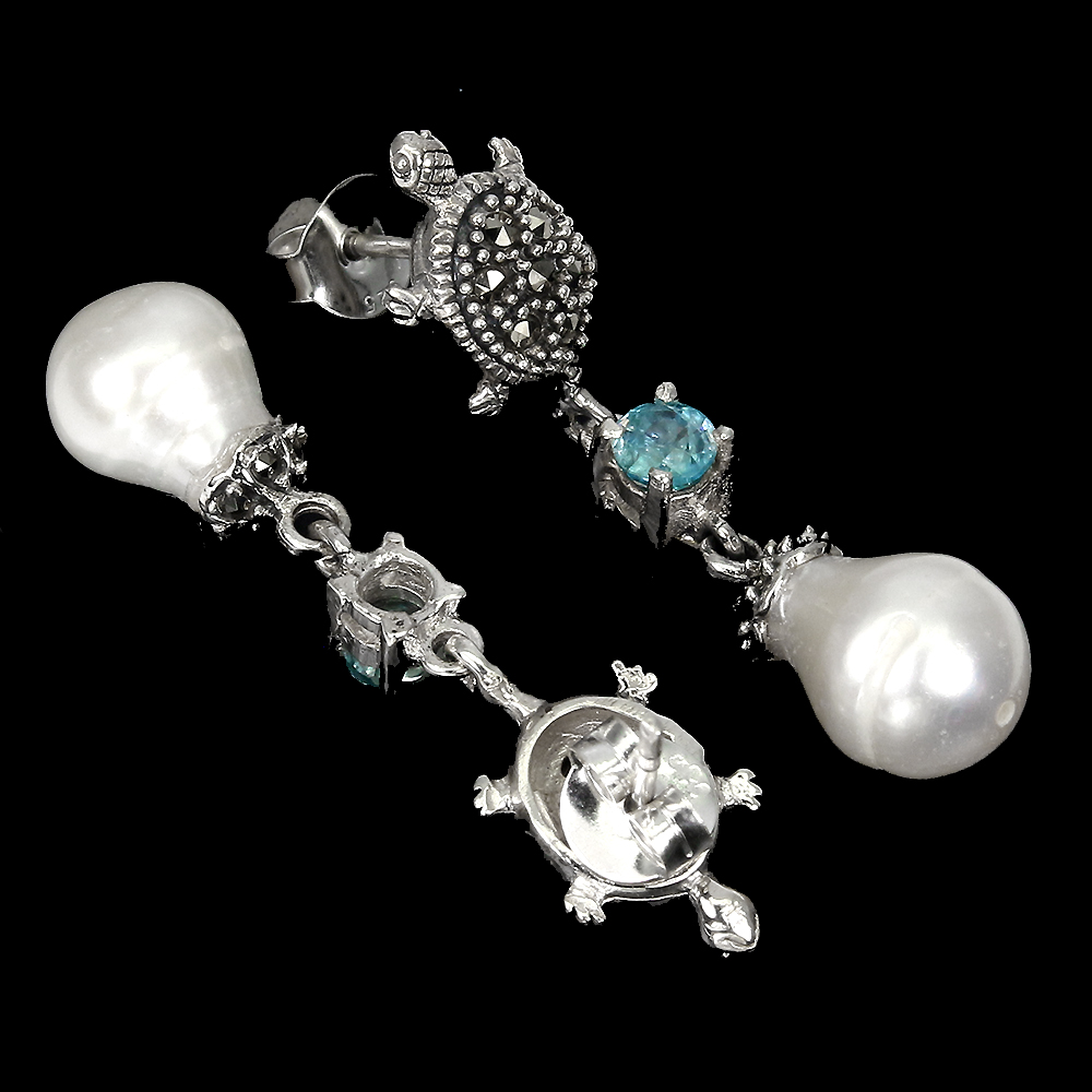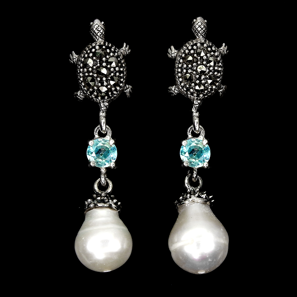 Round Blue Zircon 4mm Pearl Marcasite 925 Sterling Silver Turtle Earrings