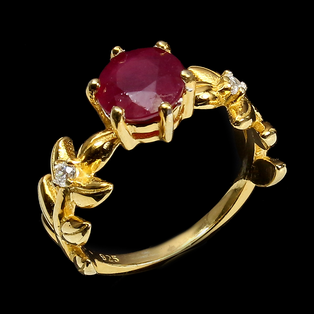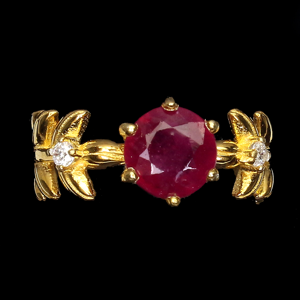 Round Red Ruby 7mm White Cz14K Yellow Gold Plate 925 Sterling Silver Ring