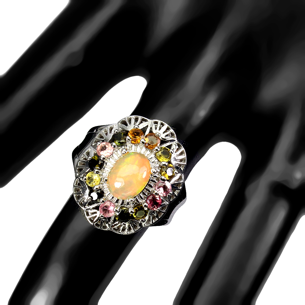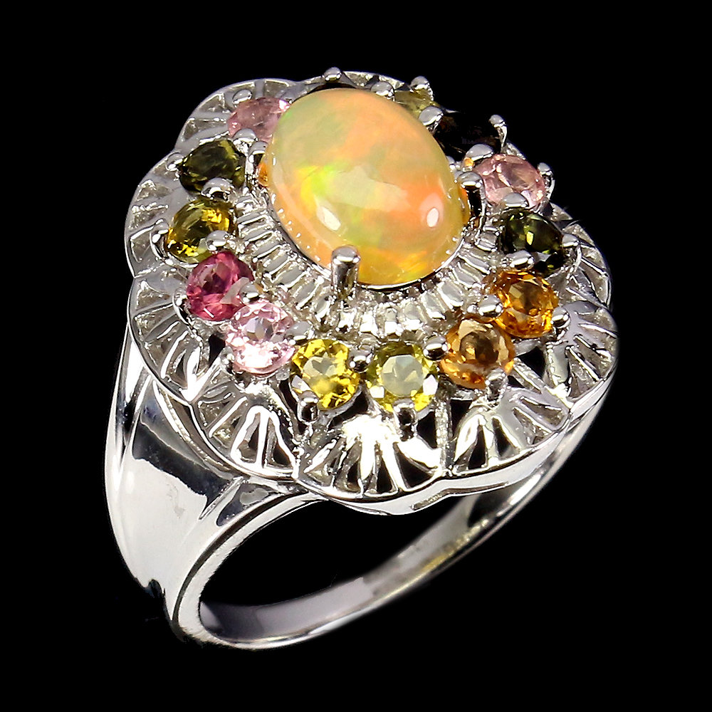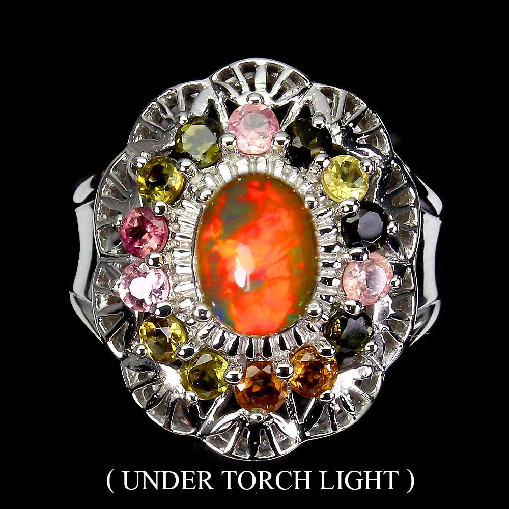Unheated Oval Fire Opal Rianbow 8x6mm Tourmaline 925 Sterling Silver Ring Size 8