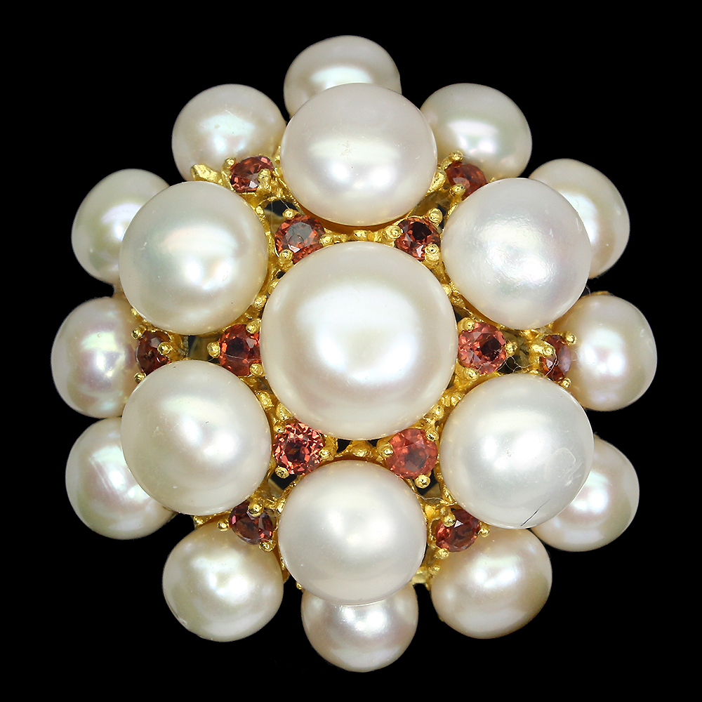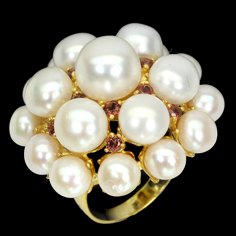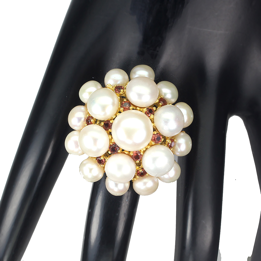 Round White Pearl 10mm Mozambique Garnet 925 Sterling Silver Big Ring