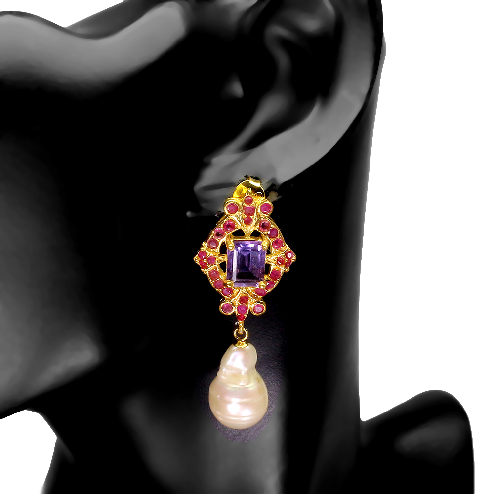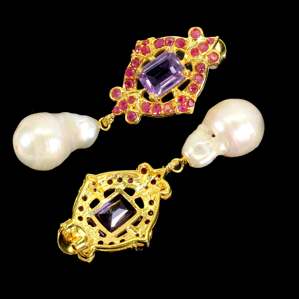 Unheated Octagon Amethyst 9x7mm Ruby White Pearl 925 Sterling Silver Earrings