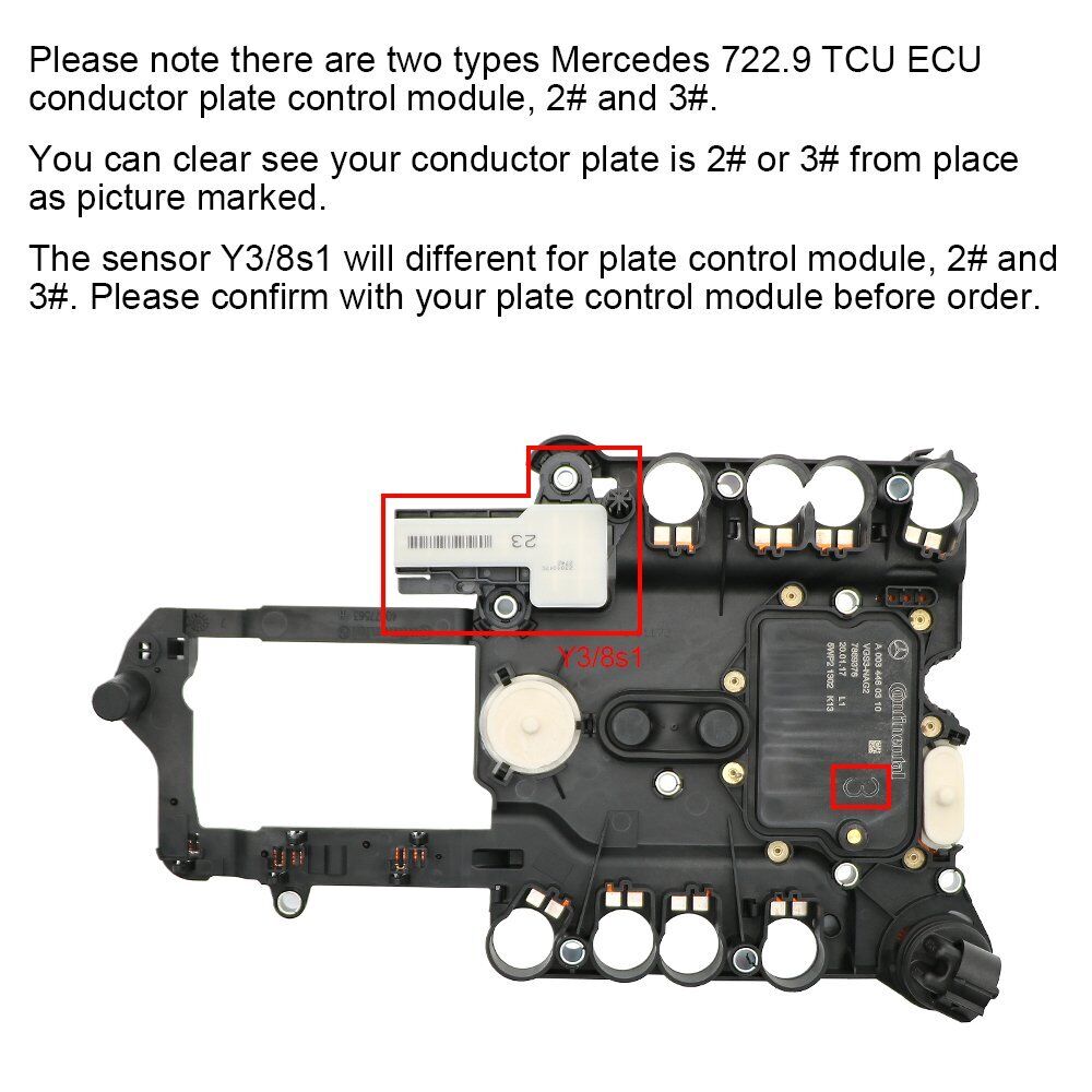 There are two types Mercedes 722.9 TCU ECU conductor plate control module, VGS2 and VGS3, the transmission sensor Y3/8s1 we selling is suit for plate control module VGS3, you can clear see your conductor plate is VGS2 or VGS3 from place as below picture marked. Please confirm with your plate control module before order, as sensor Y3/8s1 different for plate control module VGS2 and VGS3.