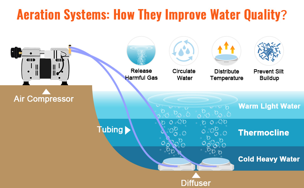 If you are looking for an efficient tool to keep your pond or lake healthy and clean, don't hesitate to choose the pond aeration system. Our aerator can easily handle ponds that are 3 acres and 50' deep. Get ready for flawless and more beautiful water! Complete accessories make it easy to use and install. Our reliable materials ensure long-lasting use. It is ideal for removing foul odors, reducing algae growth and bottom muck, and protecting fish. Start creating a healthier ecosystem with today!