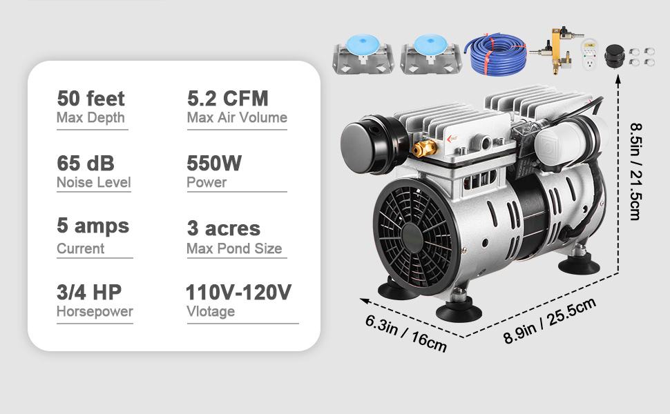 The pond aerator can aerate ponds up to 3 acres, 50 ft deep. It can pump Max. 5.2CFM of air, providing enough oxygen for your ponds and lakes.