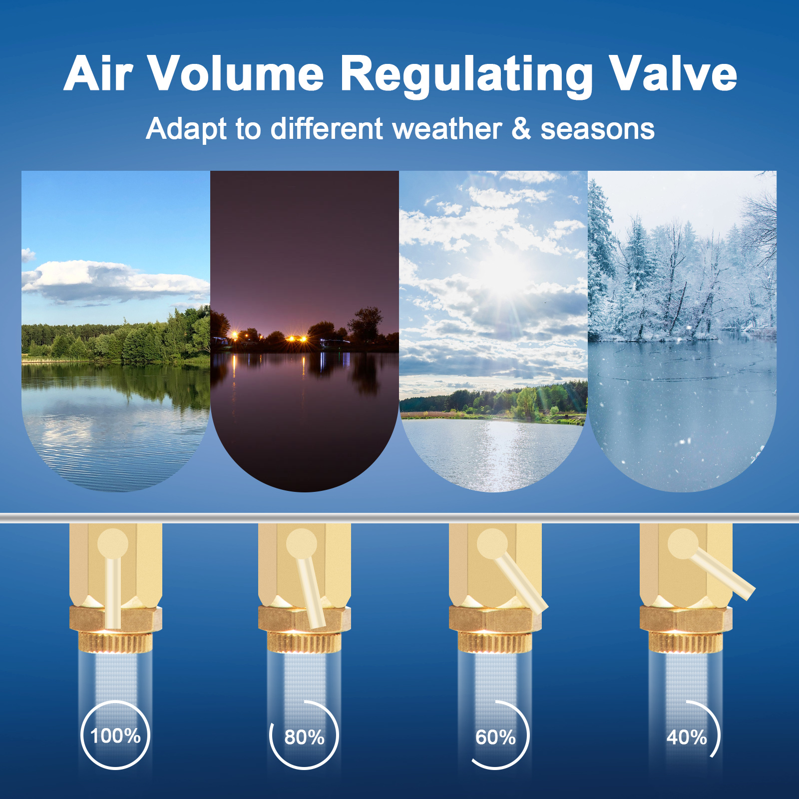 With the air volume regulating valve, our pond aerator kit can meet different oxygen needs in all weather conditions. Just adjust the valve to handle the air volume.