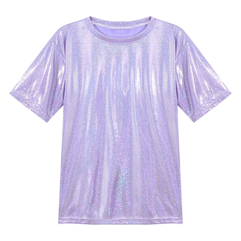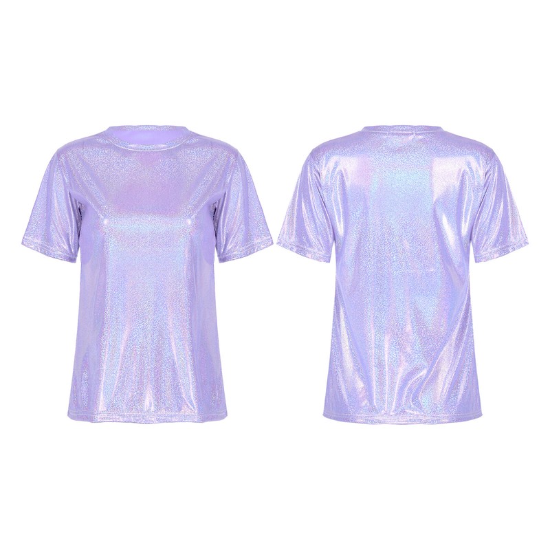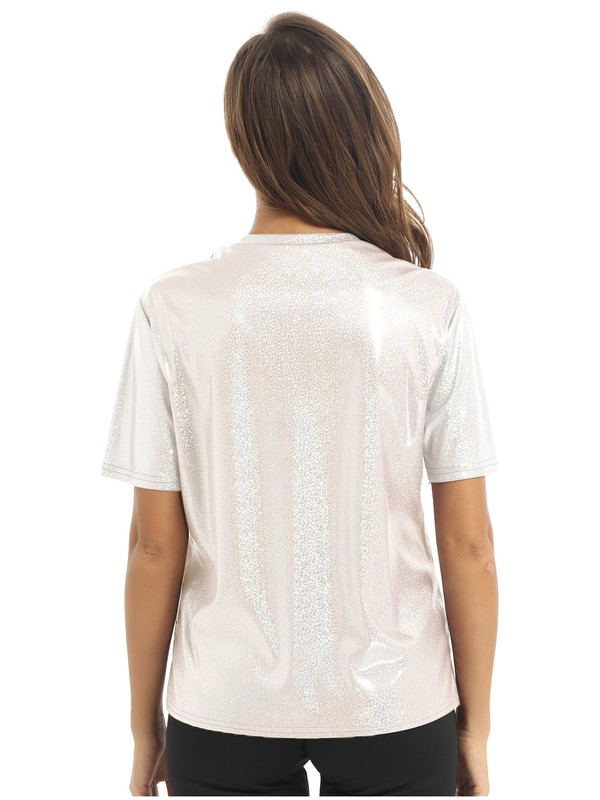 Womens Fashion Shiny Short Sleeve T-Shirt Casual Sparkling Round Neck Tops.