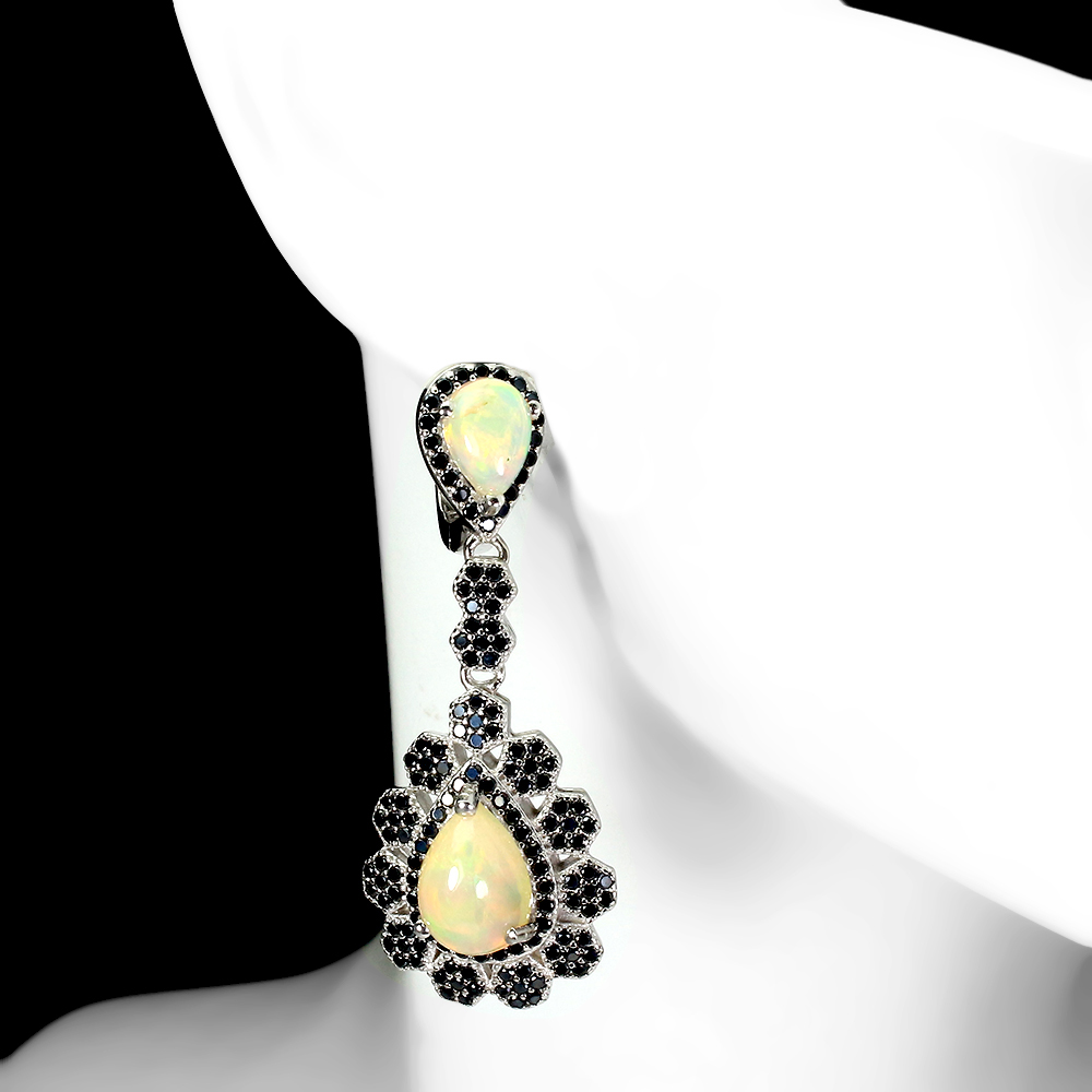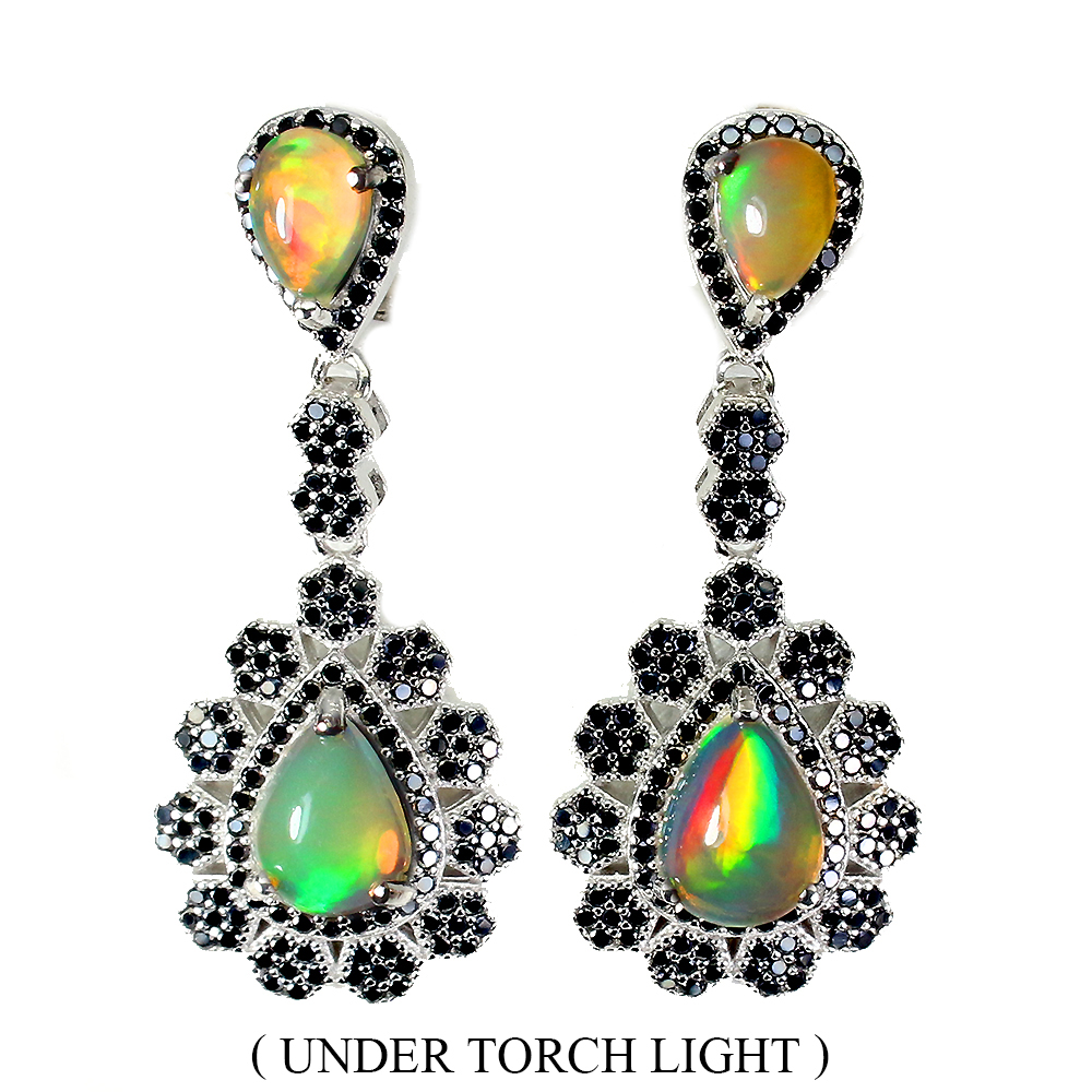 Unheated Pear Fire Opal Rainbow 9x7mm Black Spinel 925 Sterling Silver Earrings