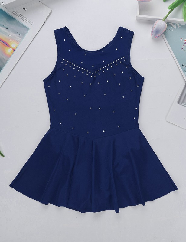 Sleeveless, illusion neck, top bodice is adorned with sparkling rhinestone detailings to improve confidence and showmanship. See-through tulle back.