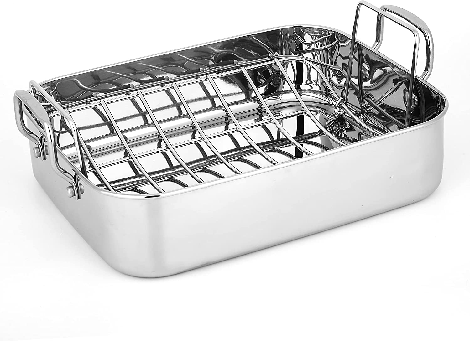 • DURABLE CONSTRUCTION AND EXTRA STRENGTH: Made of stainless steel, our roasting pan are more durable and stronger. It also has a warp resistance and has extra strength, proving how ideal our pan is. Also equipped with wide handles for a confident grip