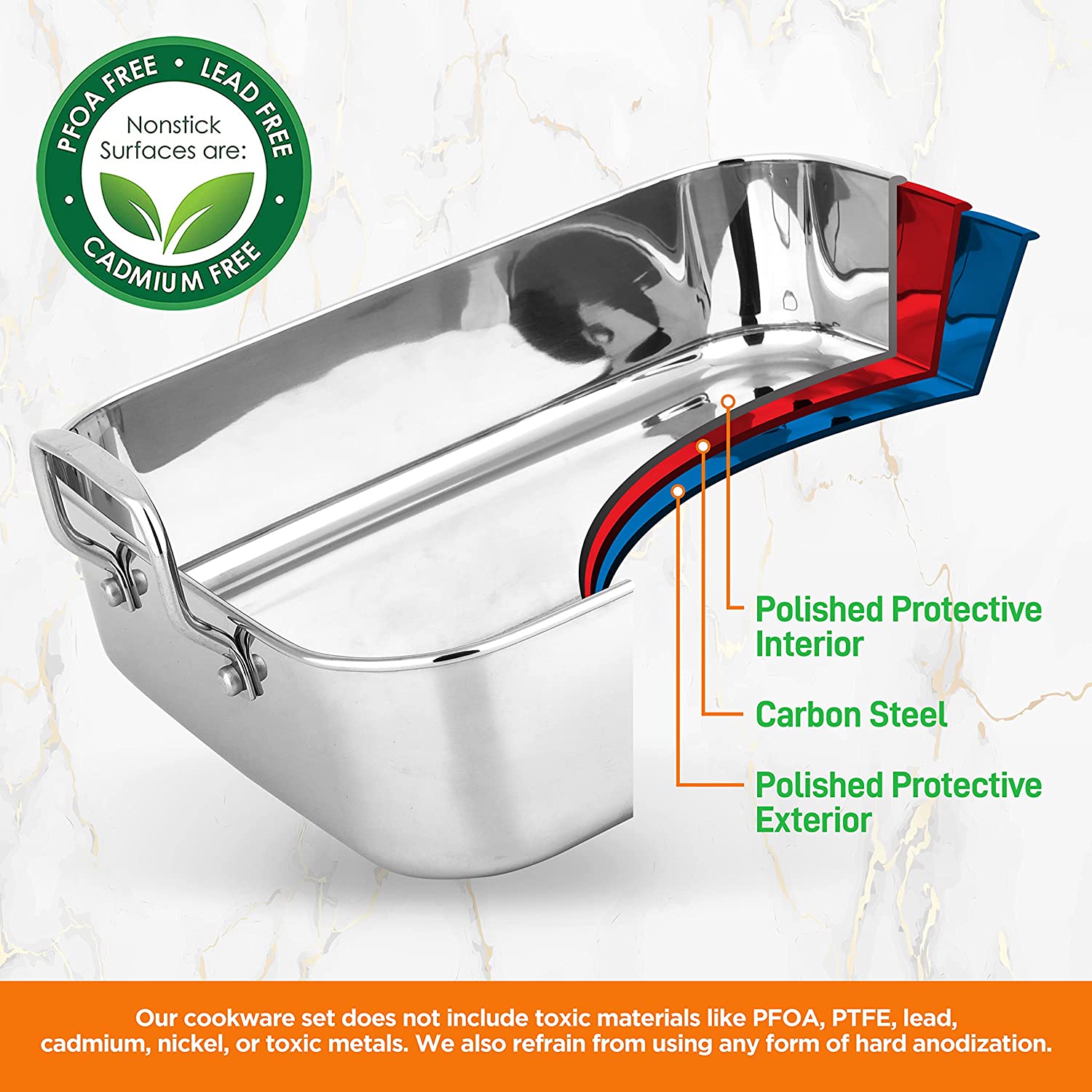 • PREMIUM POLISHED MATERIAL: Because of the polished material used in our pan, inside and out, you won't have to worry about your dish sticking to our pan! Our Roasting pan has a polished interior and exterior coating and satin bottom, Also PFOA free