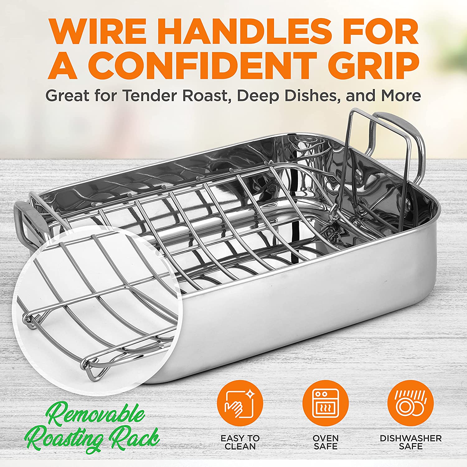 Roasting Pan with Polished Rack, Wide Handle, and Stainless Steel , Turkey Chicken Roasting Pan Great for Thanksgiving Dinners, Tender Roast, Deep Dishes, and More