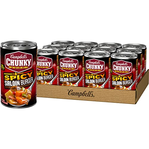 Campbell’s Chunky Spicy Sirloin Burger Soup isn’t just tasty—it's made to spice up your life. With mouth-watering, sizzling flavors and bold ingredients, this spicy soup is capable of fueling even the heartiest appetite. Seasoned with a blend of jalapeno pepper and cayenne pepper, this ready-to-eat soup is bursting with flavor from seasoned beef sirloin steak burgers, bacon, red pepper, potatoes and carrots. Each can has 19 grams of protein. It Fills You Up Right. Just pop this ready to eat soup in a microwave-safe bowl, heat and enjoy. Or, warm it over the campfire on your outdoor adventures. Whether you’re looking for quick and easy microwave soups for home or something to take on the go, Campbell’s has you covered. The soup can is recyclable for easy disposal. Take on the great outdoors with Campbell’s Chunky Spicy Sirloin Burger Soup—Soup That Eats Like a Meal. In addition to Spicy Sirloin Burger Soup, Campbell's Chunky Soup is also available in other hearty varieties, like Classic Chicken Noodle, New England Clam Chowder and more.