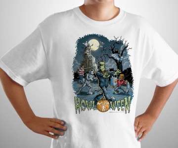 Show off your spooktacular style and enjoy a ghoulishly good time in this festive white tee shirt! Perfect for Halloween, the front graphic features Frankenstein, the Mummy, Wolf Man and Freddy Kreuger, all played by the Big Dog! In the background is the Bates Motel (or House on Haunted Hill) with a ghost lurking overhead and a bat flying in front of the moon. Howl O Ween is spelled out in dripping green goo, with the O a scary jack-o-lantern pumpkin. The best part – it GLOWS IN THE DARK!