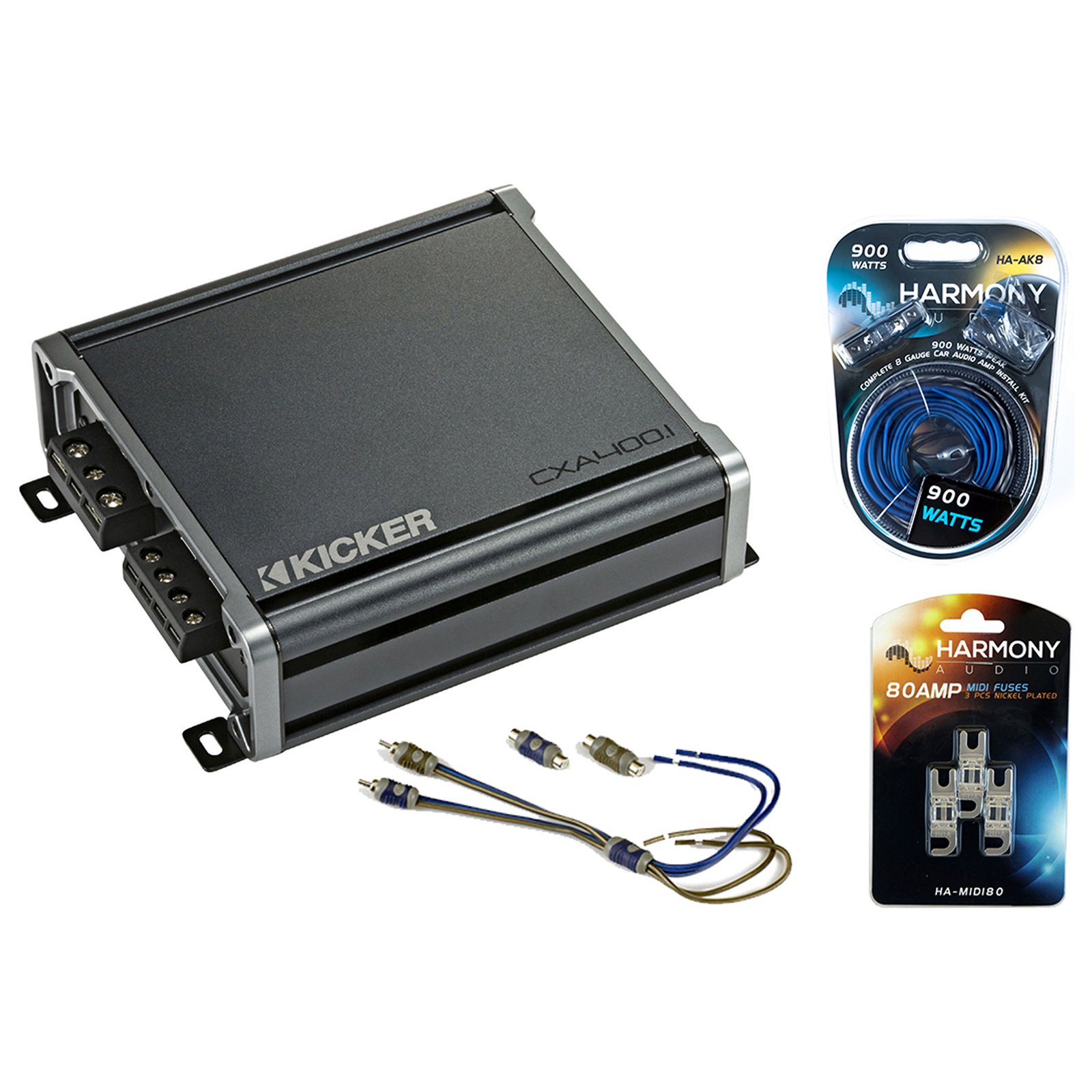 Kicker 46CXA4001 800W Sub Amp, 46KISL RCA Wire Adapter & HA-AK8 8 Gauge Amp Kit