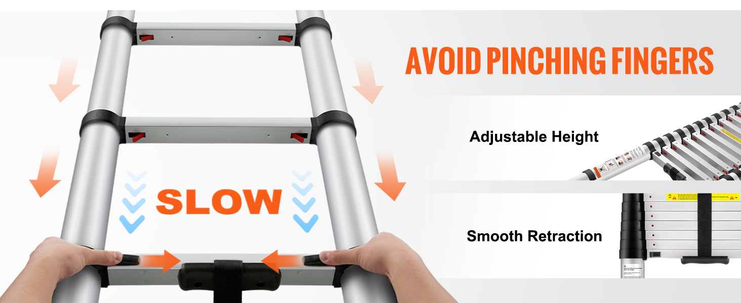 - Experience the convenience of one-button retraction with KFFKFF's telescoping extension ladder. No need to retract components separately, saving you time. The thumb button ensures a smooth and slow descent, preventing finger pinches. It's the epitome of convenience!