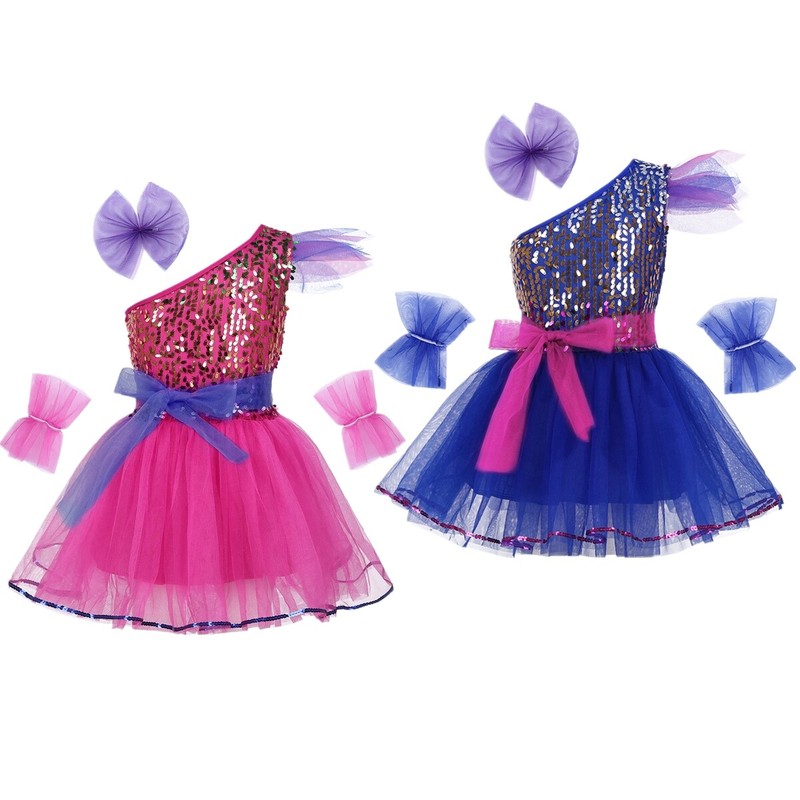 Outfit is made of polyester, mesh and sequins material, hand wash recommended.
