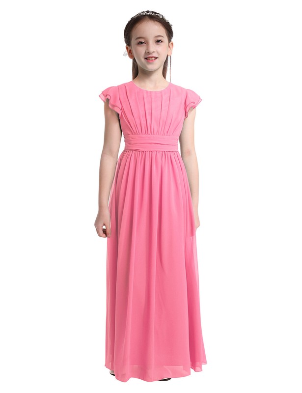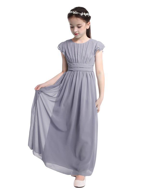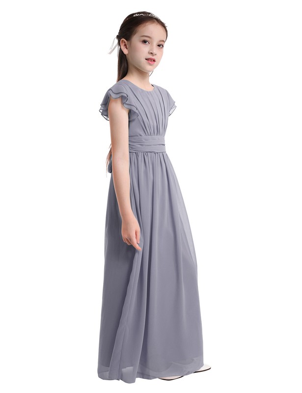 Round neck, flutter sleeves, ruched top bodice, pleated high-waisted design, sash ties at the back, hidden back zipper closure.