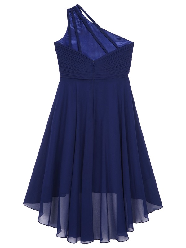 Shiny beaded adorns on shoulder, high-low chiffon skirt, ruched bodice and twisted knot, making your girl look elegant and charming.