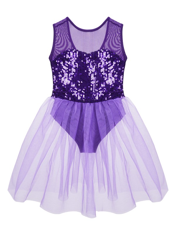 Sleeveless, shiny sequins adorned, mesh patchwork, leotard dance dress.