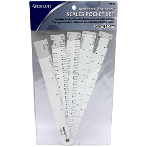 Description: Westcott Architects' & Engineers' Scales Pocket Set. Includes 5 rulers. One side features an inch scale in 16ths. The reverse side is calibrated in centimeters/metric scales. 6 inch (15cm).