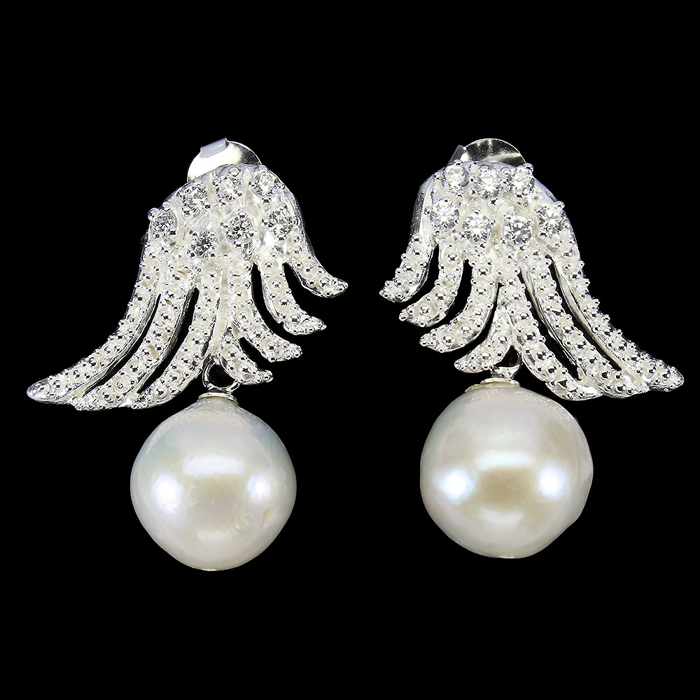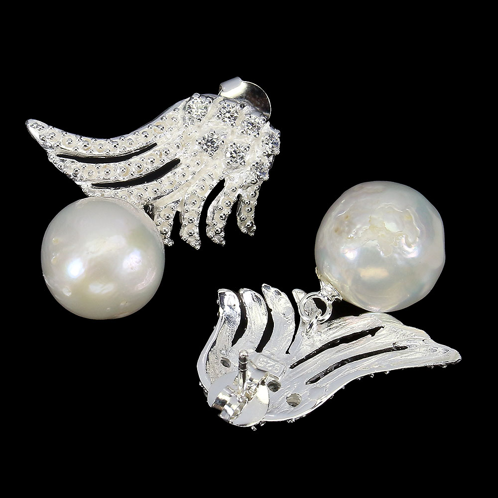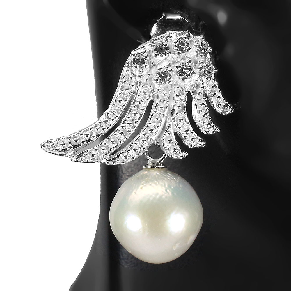 Natural Baroque White Pearl White 14x13mm Topaz 925 Sterling Silver Earrings