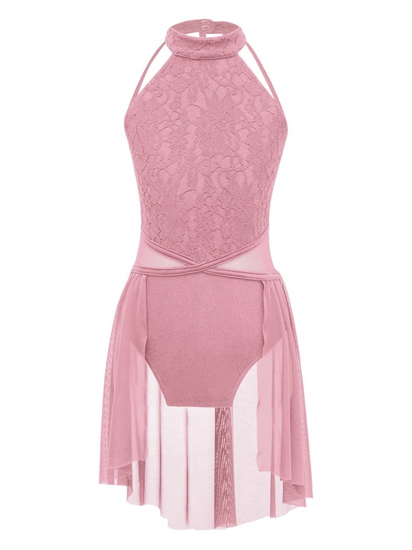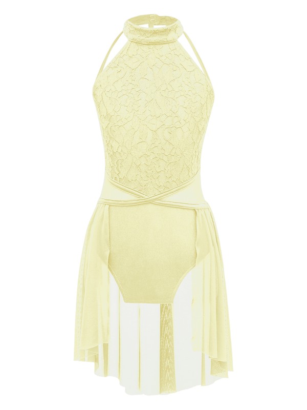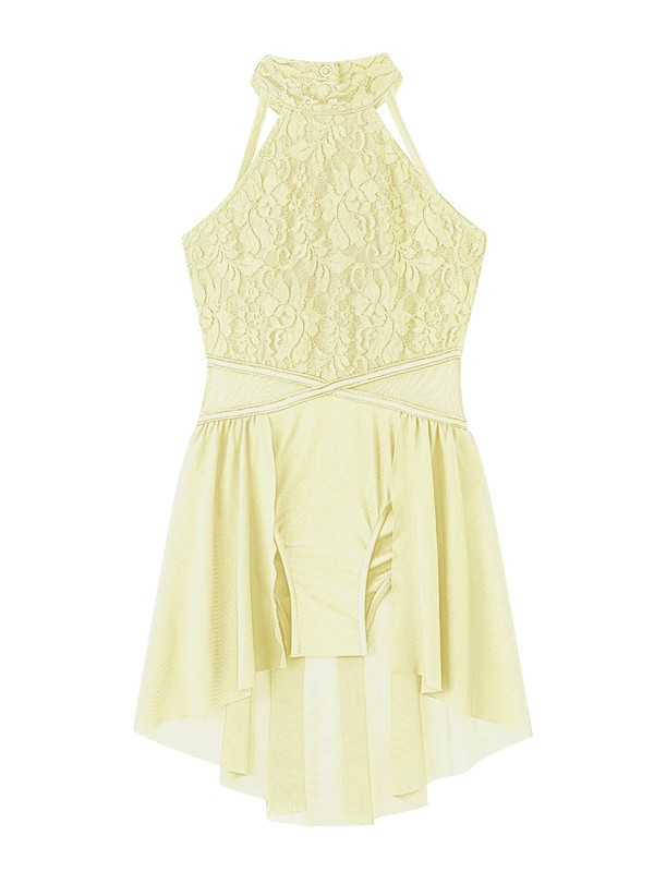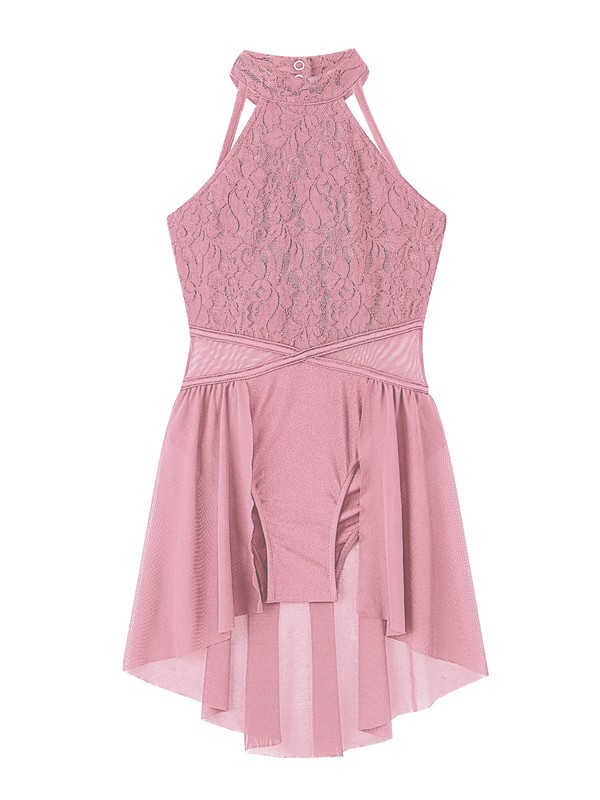 The leotard with sleeveless and round collar, button closure back and straps hollow style, lace floral in front.