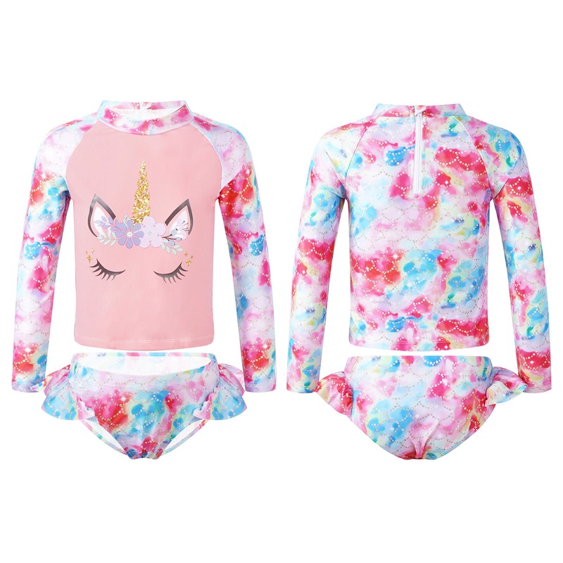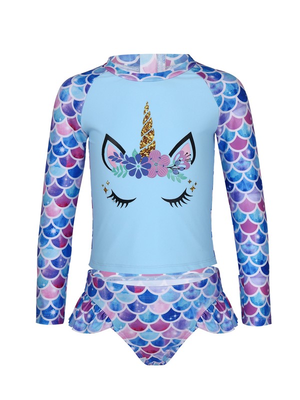 2Pcs Kinder Mädchen Fischschuppen Print Rundhalsausschnitt Lange Ärmel Cartoon Horse Print Tops und Slip Bademode.