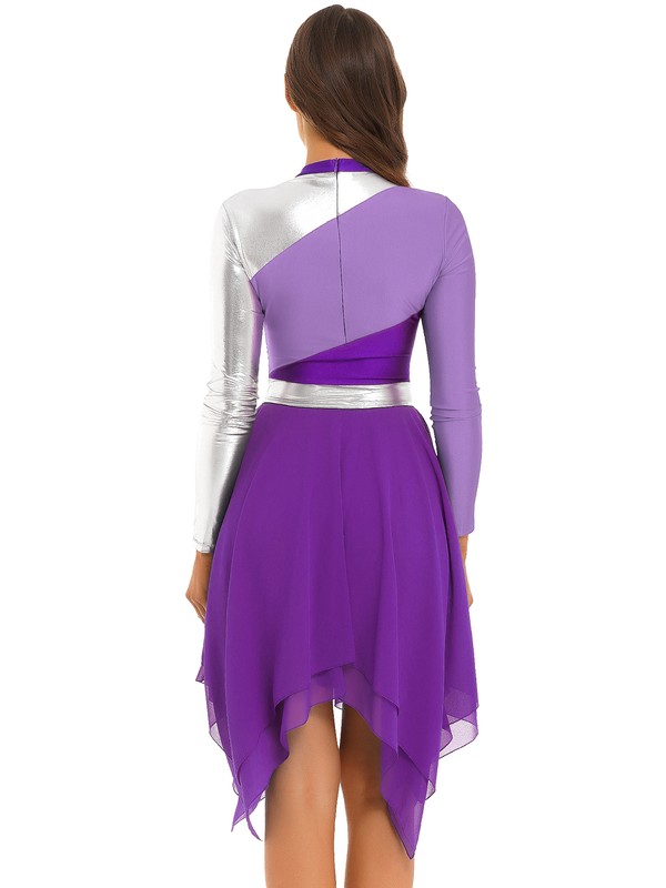 Long sleeve dance dress for women, round neck, color block patchwork, back invisible zipper closure, easy to put on and off.