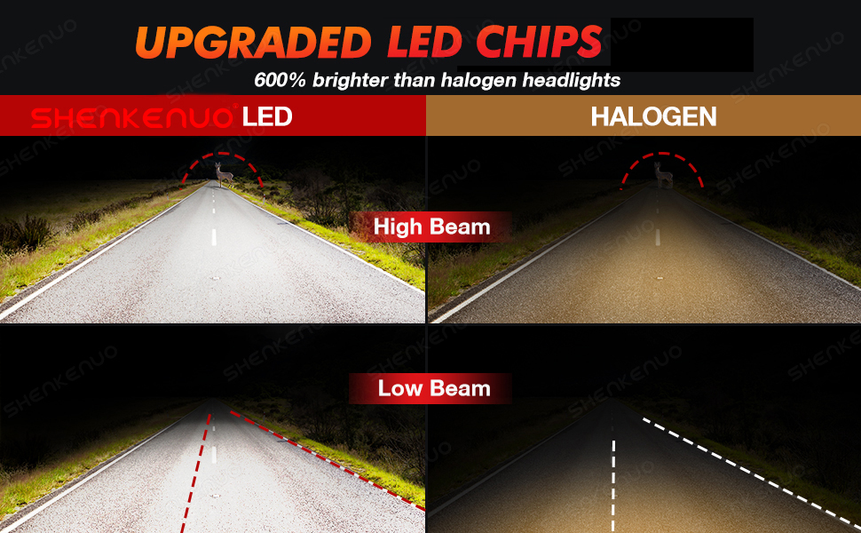 See and be SeenSHENKENUO automotive lighting promote safety through better visibility and illumination of the road. Better lighting lets drivers and road-users see more, sooner and more clearly – and thus adapt to the situation, which can help all road-users are seeing and be seen sooner to avoid potential hazards. | Powerful Cooling SystemWith a Whole aviation aluminum housing, 1,2000 RPM high-speed silent turbo fan and Ultra-thin double copper tube heat dissipation,SHENKENUO LED headlight bulbs provide a triple cooling heat dissipation system and make a lifespan of up to 50,000 hours. | Advanced Driver SystemThe CABbus ready makes it to be compatible with 98% of vehicles without computer system error problems. No errors, no flickering, no electromagnetic interference. Plug and play. |