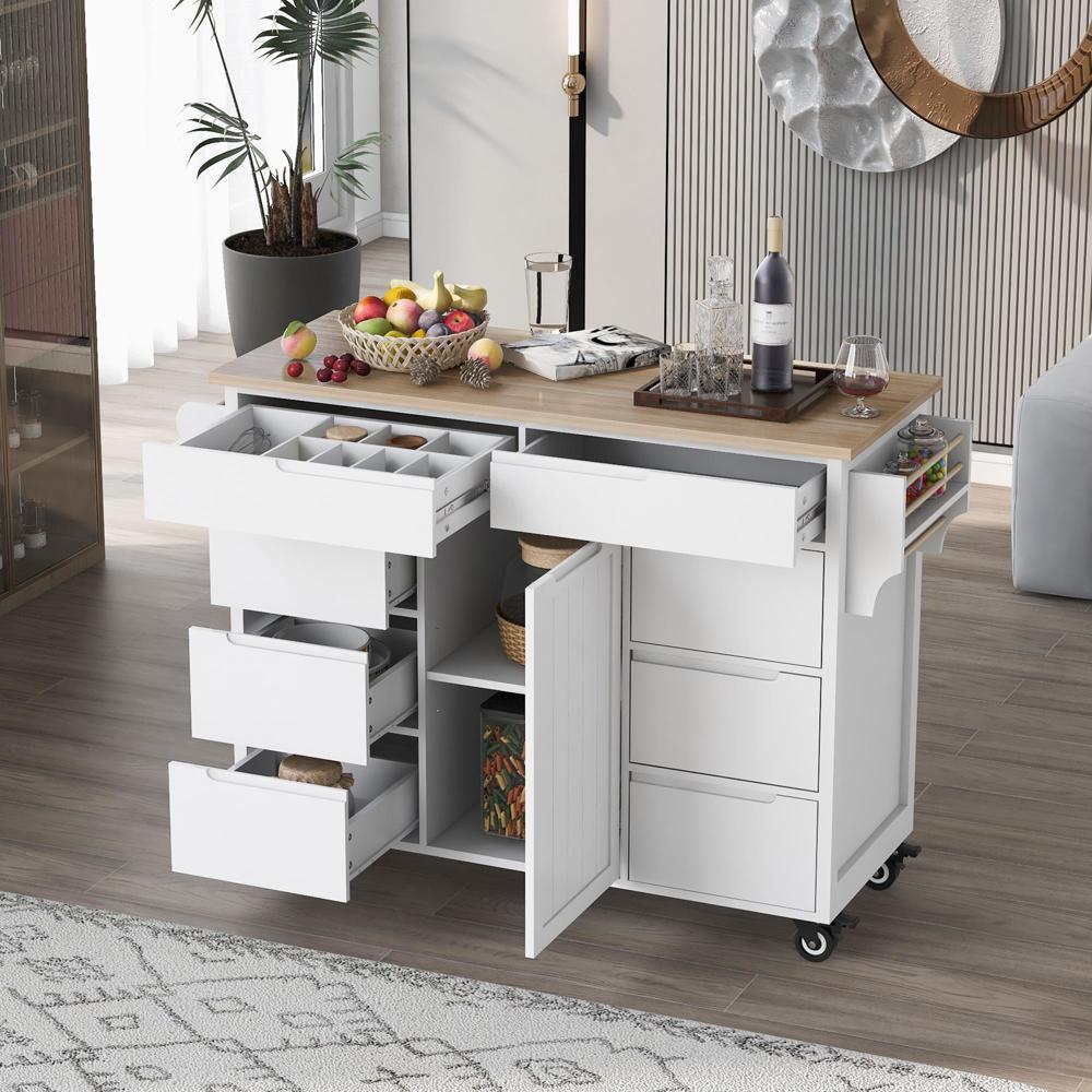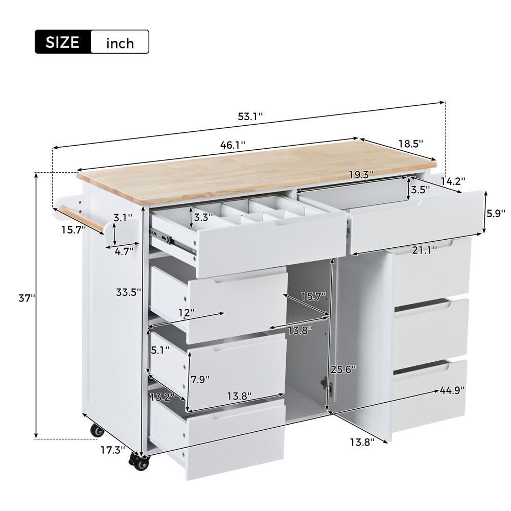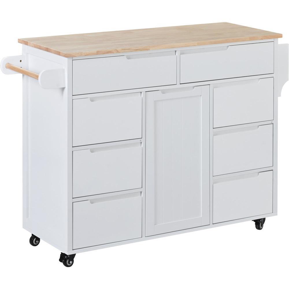 K&K Store Kitchen Cart with Rubber Wood Countertop , Kitchen Island has 8 Handle-Free Drawers Including a Flatware Organizer and 5 Wheels for Kitchen Dinning Room, White