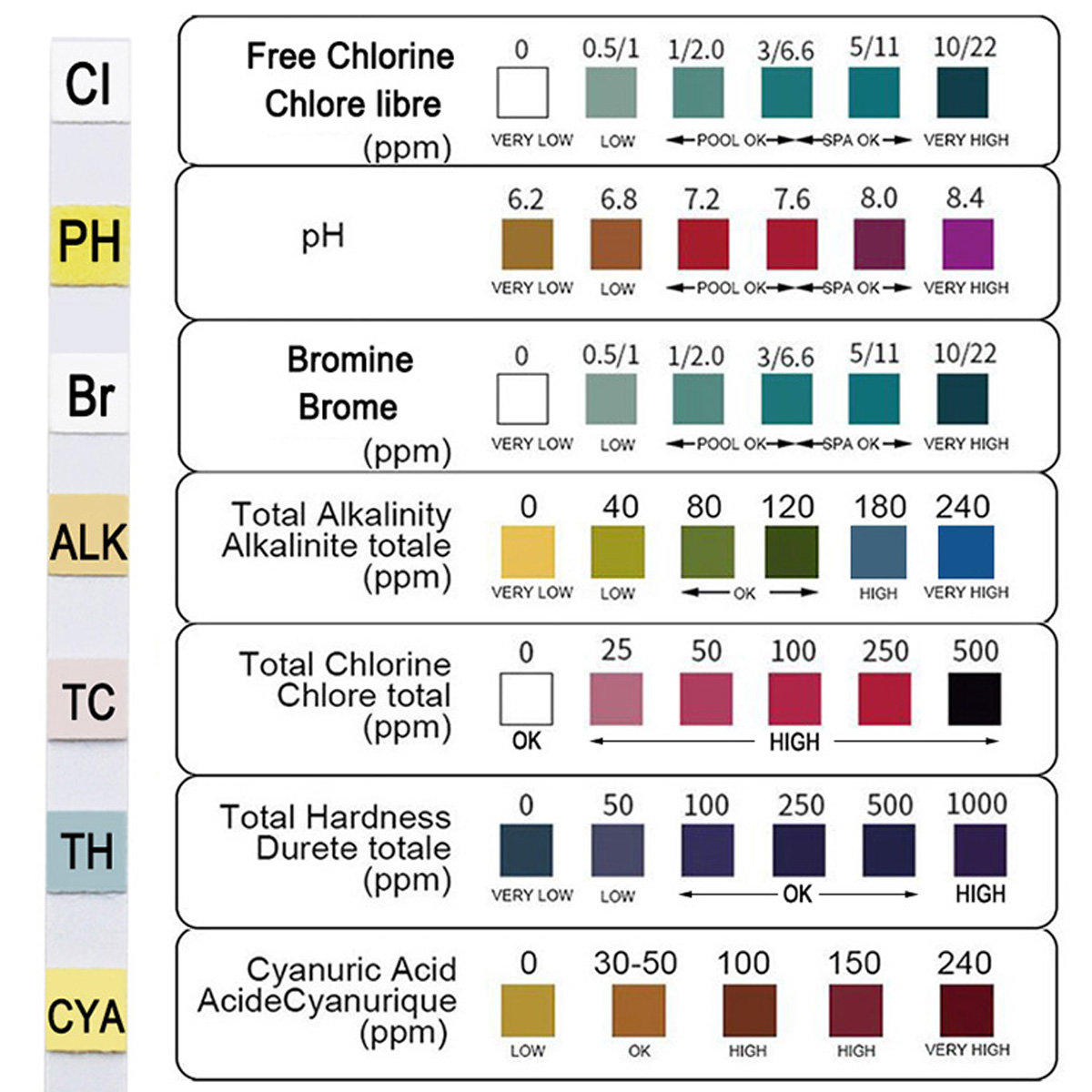 Test items: Hardness Total Alkali Cyanuric Acid Total Chlorine Residual Chlorine Bromine PH