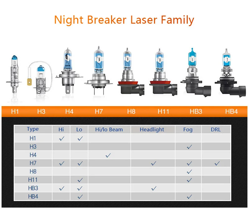 And last but not least - OSRAM NIGHT BREAKER LASER convinces with its unique design with laser-etched product name and a complete portfolio (H1, H3, H4, H7, H8, H11, HB3, HB4). The ideal lamp for drivers who know the difference that powerful automotive lighting makes!