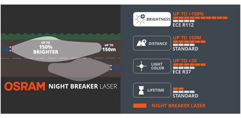Discover the next generation of NIGHT BREAKER LASER - the brightest halogen automotive light from OSRAM! Using an innovative laser ablation technology these headlight lamps shine up to 150% brighter compared to the minimum legal standard.