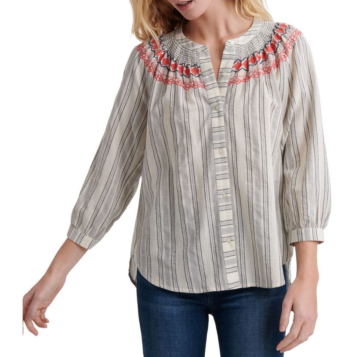 LUCKY BRAND Women's Embroidered Smocked Peasant Button Down Shirt Top XS TEDO