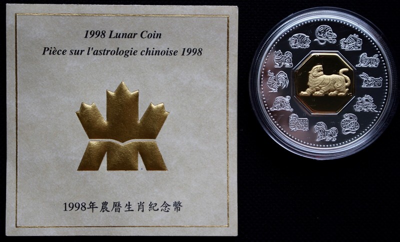 1998 CANADA $15 STERLING SILVER GOLD-PLATED (24 kt) CAMEO LUNAR COIN - Year of the Tiger