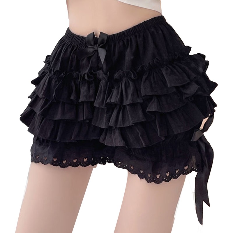 Tiered ruffled design, bowknot decoration. Heart-shaped hollow out pattern decorated at the hem of bloomers. It’s really cute.